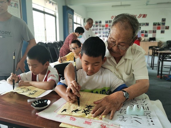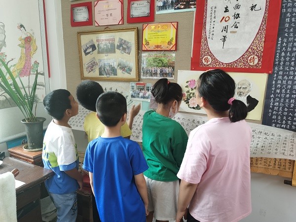 课堂上,五老志愿者戴源鑫老人向孩子们介绍了书法的历史以及学习书法的好处,随后讲解了书法学习的用具以及步骤,着重强调了在书法学习中的注意事项。小朋友们认真地听讲,不是还会拿起旁边的毛笔及字帖进行观察。讲解结束后,戴老带领小朋友们参观了书画协会的书画馆。来到书画馆,小朋友们都被挂在墙上的书画作品吸引了,大家都围在作品前观赏。戴老一边介绍墙上的书画作品,一边叮嘱小朋友们要珍惜学习的时间,勤加练习,后期定能创作出更好的作品。参观结束,开始进入课堂正题---书法培训。戴老一边讲解一边进行示范,小朋友们也学着戴老的样子握笔、写字,一横一竖、一撇一捺,时间在浓郁的墨香中一点一点流逝。