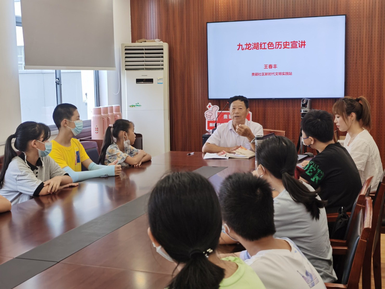 为弘扬和传承红色记忆,使孩子们在红色文化的熏陶下茁壮成长,8月10日上午,贵驷社区新时代文明实践站邀请浙江有礼-微笑镇海宣讲团中的王春丰老师为辖区内的学生们带来了一堂别开生面的九龙湖红色历史宣讲。