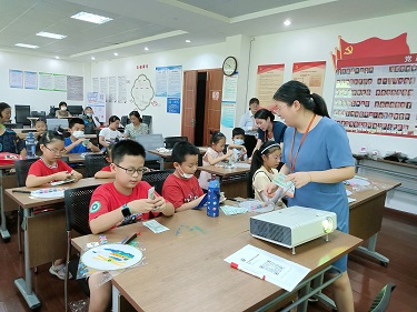 最后,到了大家最喜欢的环节:夏日团扇制作。老师为大家带来了制作团扇的材料包,有各种图案的。大家可以根据自己的喜好挑选团扇来上色。制作完成的团扇可以带回家,给大家带来清凉。