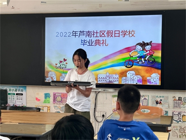在毕业典礼上,芦南社区假日学校负责人江雁对今年的假日学校工作进行了总结,用PPT的形式为大家播放了这段时间的精彩集锦,共同回顾了这二十多天在假日学校中所学习的点点滴滴。今年芦南社区假日学校自7月18日开课以来,精心安排了多种多样的假日学校活动:红色传承主题教育宣讲活动;手作冰粉沁人心;青少年心理健康讲座、普法讲座;手绘十礼环保袋diy活动;绘时代新“帽”等等寓教于乐的活动,深受学生们的欢迎。接下来,学生们纷纷跃跃欲试为大家表演节目。武术表演刚健威猛;表演舞蹈的学生舞姿曼妙、步态轻盈;诗歌朗诵洋溢青春蓬勃朝气......参加表演学生们,各个精神饱满。最后芦南社区关工委对此次假日学校活动中表现突出、积极参与各项活动的学生颁发了荣誉奖状。
