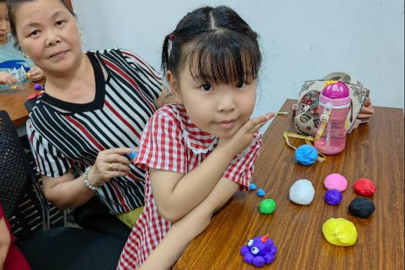 志愿者讲解粘土制作的来源、分类以及超轻粘土的特性和基本技法之后,对大家进行简单分组,小朋友有序领取了手工材料包,有的立刻就投入制作,有的认真构思,有的和陪同而来的老人们一起讨论着,每个人都全心投入。不一会儿一个个栩栩如生的作品就诞生了。