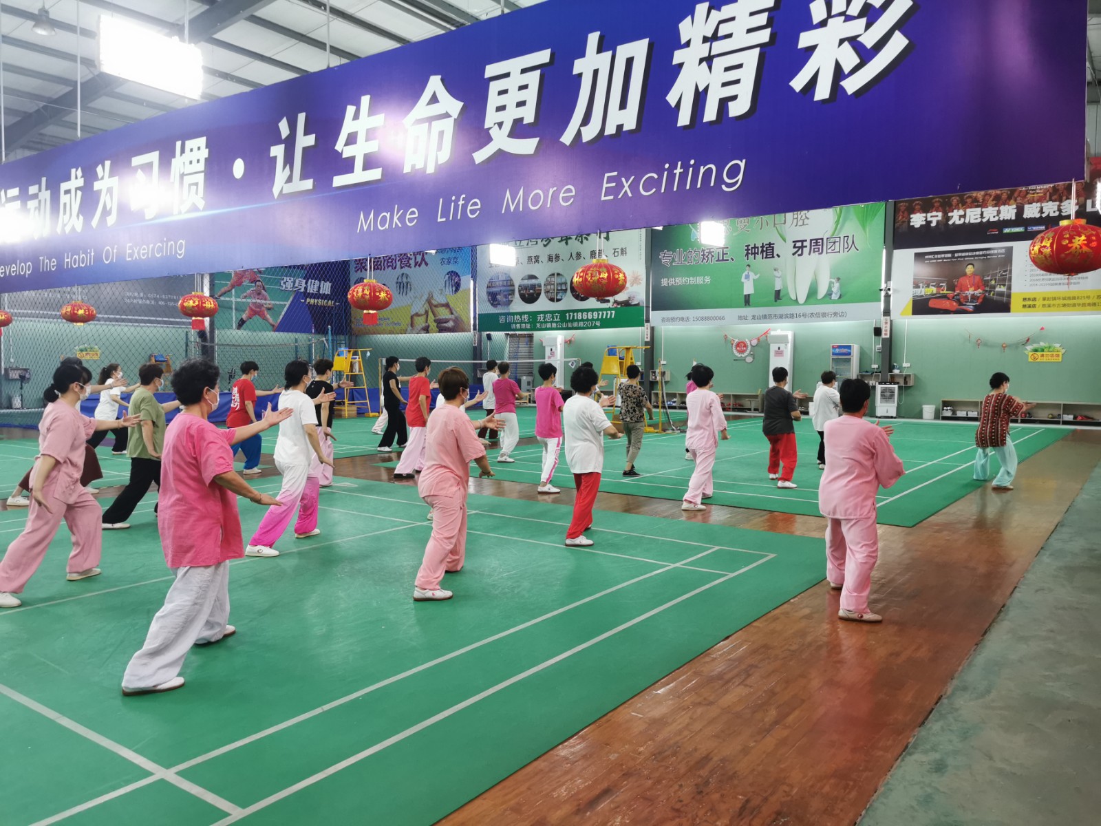 太极拳班的学员在刘莉萍老师的带领下认真地打起了二十四式太极,四十二式太极,36名学员整整齐齐排列在场地正中,一招一式都是那么认真,那恢宏的气势不禁令人赞叹不已。