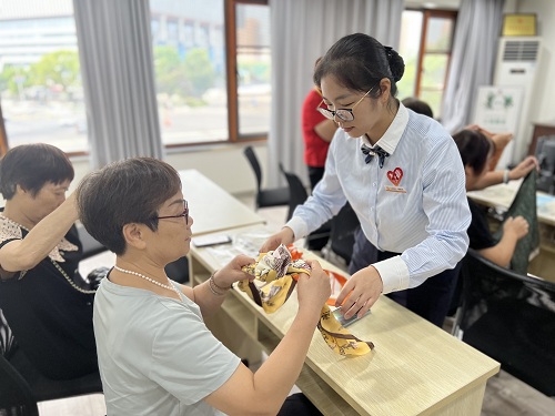 活动现场热闹非凡,阿姨们有的结伴而来,有的盛装出席,大家对着颜色艳丽的丝巾都赞不绝口。宁波银行的顾老师给阿姨们讲述了丝巾不仅能够起到保暖的作用,而且还能提升整个人的外在形象。接着,顾老师一边介绍丝巾的不同系法,一边动手做起了示范。“看老师系起来很简单,实际操作起来还是有很多学问在里面的。”在场的阿姨们也跃跃欲试,拿着各自分到的丝巾开始尝试学习。有的试着给自己系,有的给身边的人系。有些阿姨对自己系出来的效果不满意,就拉来老师手把手地进行单独辅导。不一会儿,在阿姨们的努力下,一条条丝巾就成了脖颈上的一道道“亮丽的风景”。