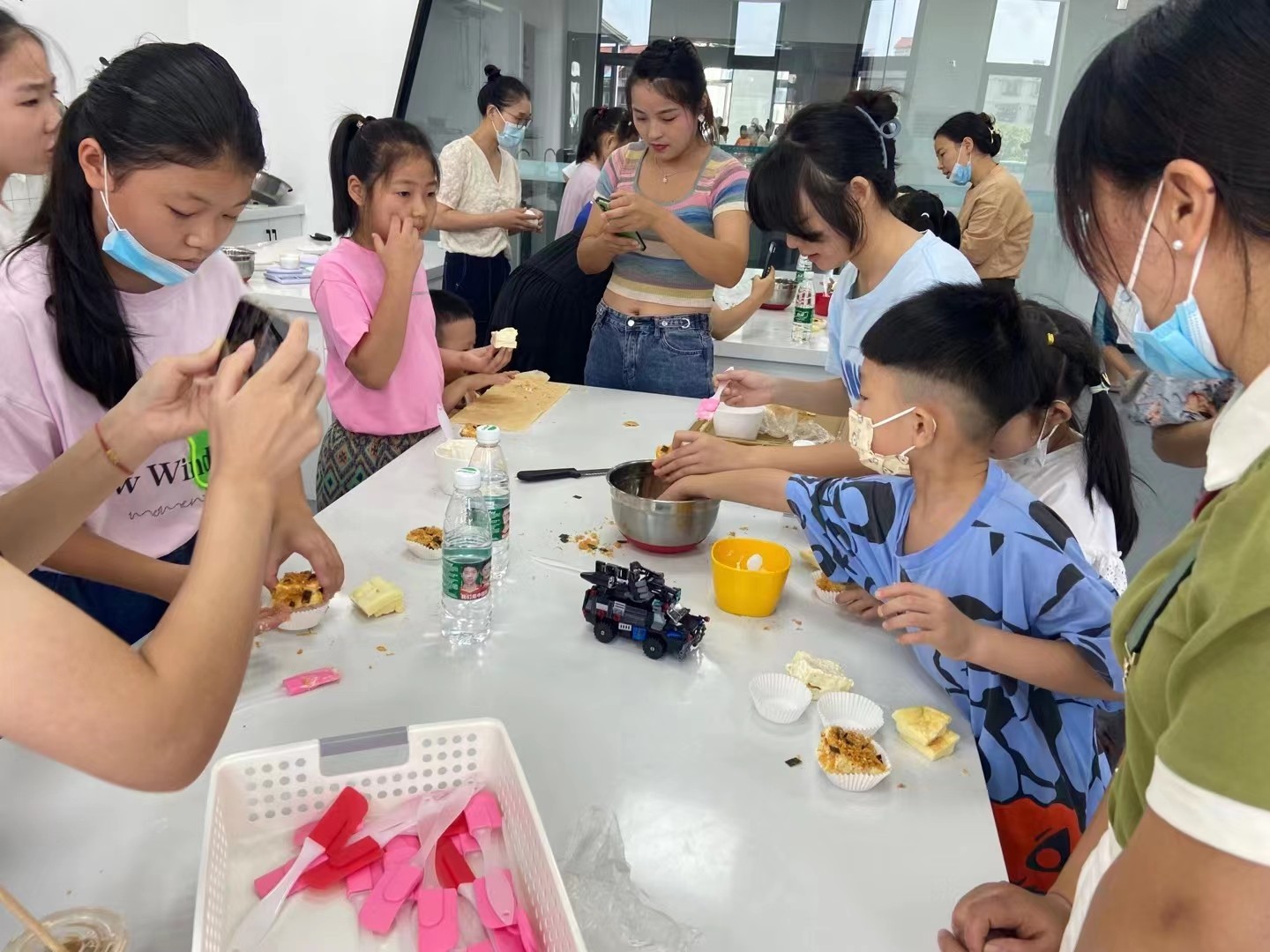 面点老师为大家准备好了食材,分好组,接下来老师先教小朋友们制作过程,然后再由小朋友们自己动手亲自完成。切馅、称重、搓圆、压花脱模...大家分好工,不一会形态各异的漂亮月饼就成型了,马上送入烤箱开始烘烤了。