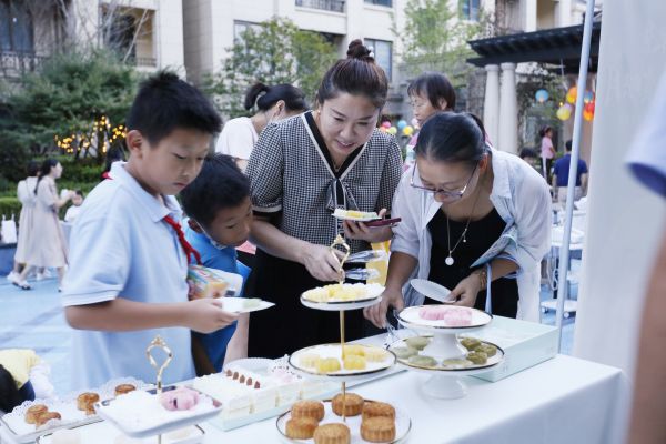 除此之外还准备了丰盛的甜品台,精致的糕点、清香的桂花酒广受欢迎,大家有序的排队领取美食,川流不息的人群手中,大家手捧各种小吃,齿颊留香。