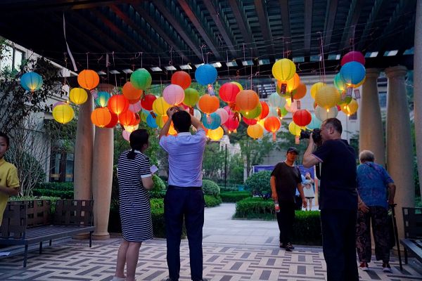 活动现场各处都充满中秋元素,首先映入眼帘的就是硕大的宇航员登月灯,甚是壮观。灯下布置了一条长长的“灯谜走廊”,五颜六色的中秋灯笼发着光,随着晚风轻轻飘动,将现场装扮得喜庆温暖。周围绿树环绕,树枝上绕满了星星灯串,灯光闪烁、月光皎洁、星光盈盈,交相辉映,不由令业主感叹:“好美啊!太有中秋氛围了,看得出来社区可真是用了心。”