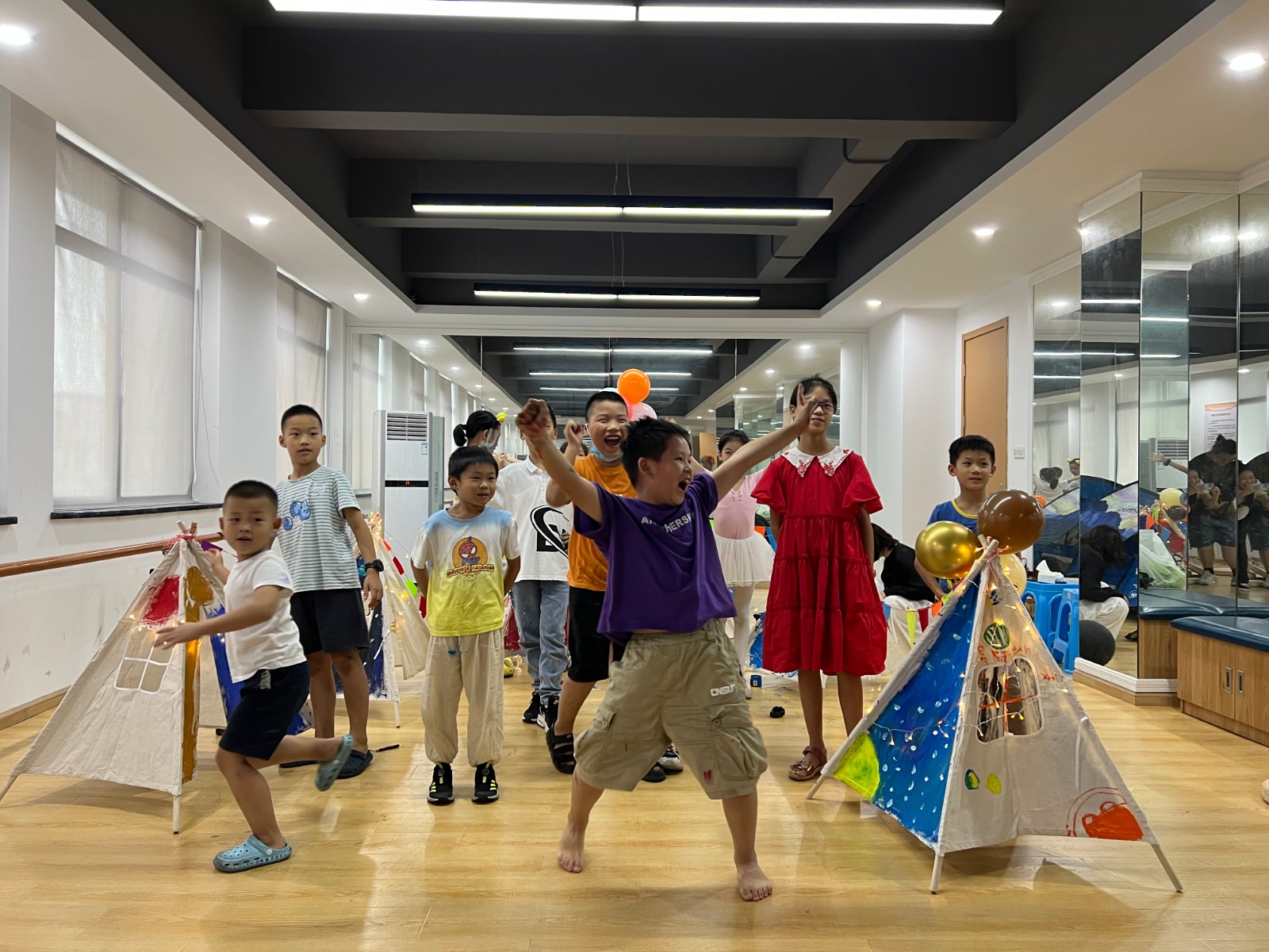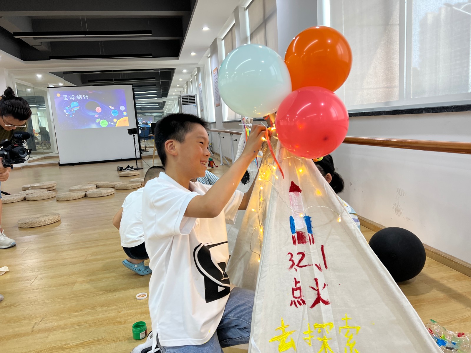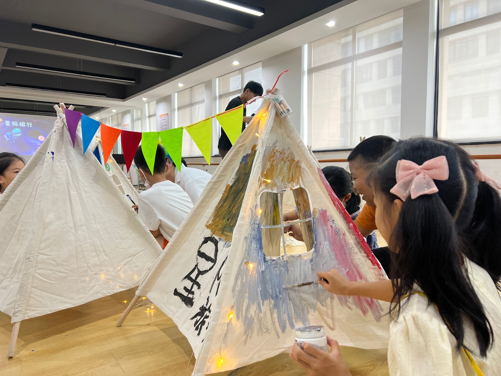 作为新晨社区儿童友好活动季的首场活动,在完成基础学习以后,孩子们拿起手中的画笔在敞篷上,画下了一飞冲天的火箭、形态各异的星球、昂首挺胸的宇航员……不一会儿,一个个充满想象的“星空帐篷”就在孩子们的共同努力下完成了。小朋友们一边欣赏着彼此的作品,一边分享着自己的奇思妙想:“我画的是奶酪星球,是我想象里自己探索发现的新行星”、“宇宙那么大,一定也有我画的这颗彩虹色的星球”......