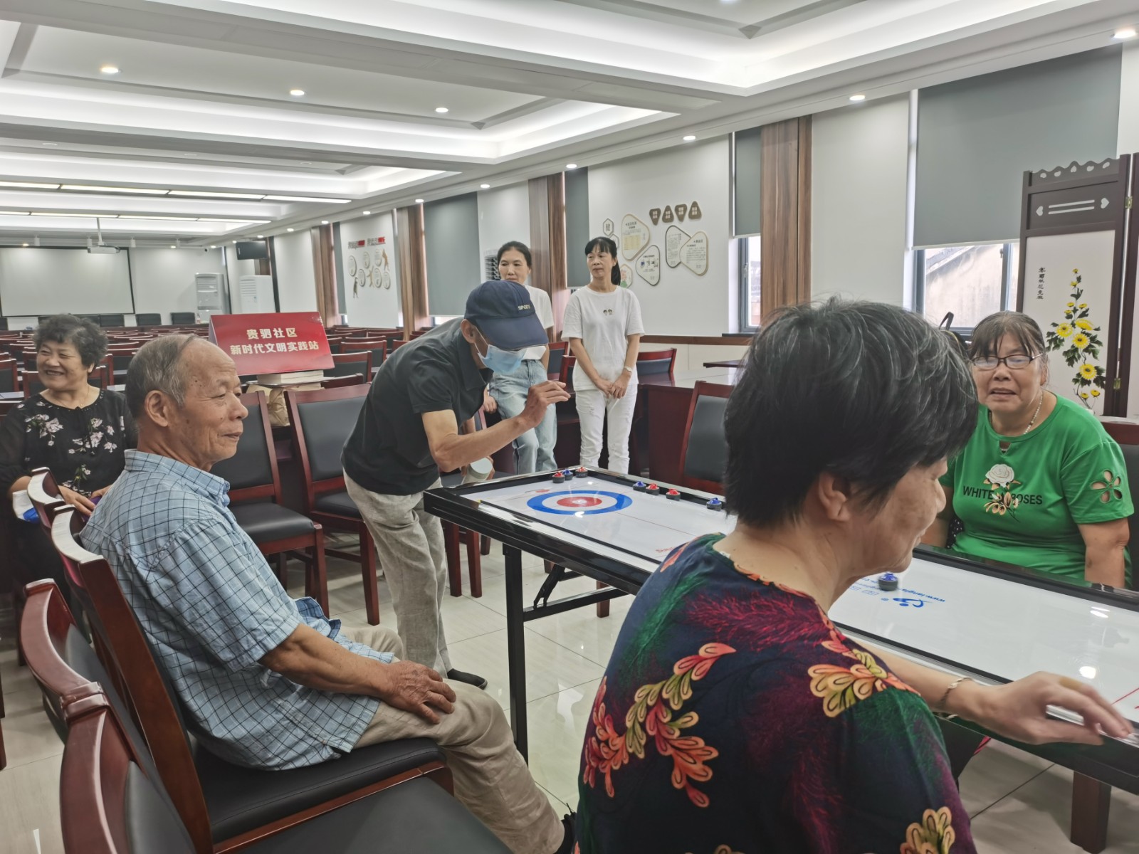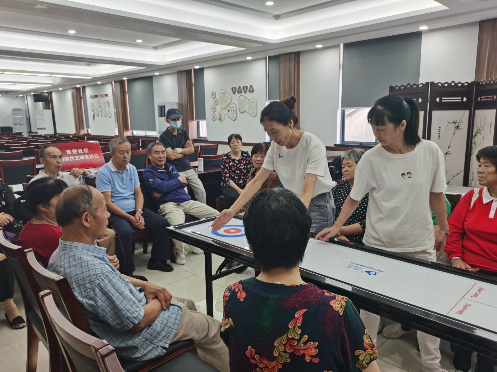 “握冰壶的手要成V字,这样更有利于掌握好方向,另一只手不能碰到桌面,冰壶推出去的时候不能太用力,也不能太轻,要运用巧劲,大家看我的动作,然后就开始亲身体验吧。”葛老师的讲解通俗易懂,大家都听得津津有味。虽然是第一次接触桌面冰壶这个运动,但是大家都上手特别快,迅速掌握了基本的投壶动作和计分标准,认真斟酌每一只壶投放的位置和力度。掌声、加油声、笑声回荡在居民当中。