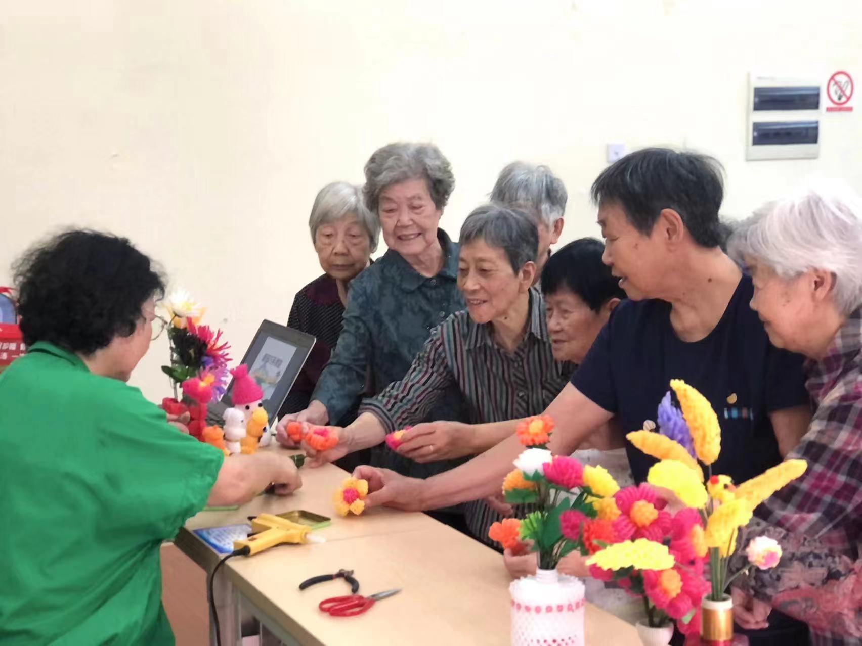 活动前,老人们早早来到活动现场,他们满心欢喜,期待着活动早点开始。活动开始后,金珊珍先向老人们深入浅出地介绍水果塑料保护套巧变花儿的制作步骤和技巧要点,她一边详细讲解一边进行现场制作示范。随后,老人们在金珊珍及志愿者们的耐心指导和帮助下,纷纷动手制作,没过多长时间,一朵朵色彩艳丽的花儿“陆续绽放”,看着自己亲手制作的作品,老人们的脸上洋溢着幸福快乐的笑容。最后,老人们人手一朵花儿拍照留念,场面十分热闹而温馨。