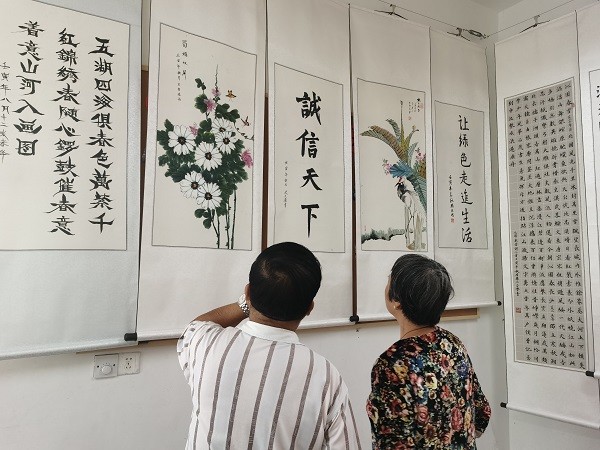 “这些作品一点都看不出是农民画出来的,真是了不起!”“这个基本功没个几年都画不出来的!”9月28日到10月8日,一场以“墨香迎华诞 妙笔绘丹心”为主题的书画作品展在霞浦街道陈华浦文化礼堂举行,60余幅风格各异而又意趣相谐的书画作品吸引了众多书画爱好者及居民前来参观,或探讨切磋技艺,或拍照学习,活动现场好不热闹。