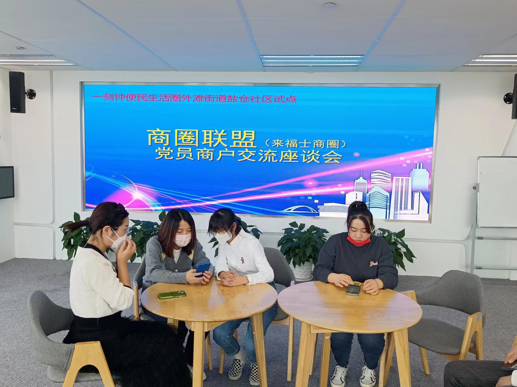 钟对商圈相对封闭,内部企业、商户交流少,党建工作以单独开展的情况,盐仓社区党委联合来福士商户全面开展区域性党群服务中心,为企业、商户提供“零距离”服务,打造“15分钟”党群服务圈”。