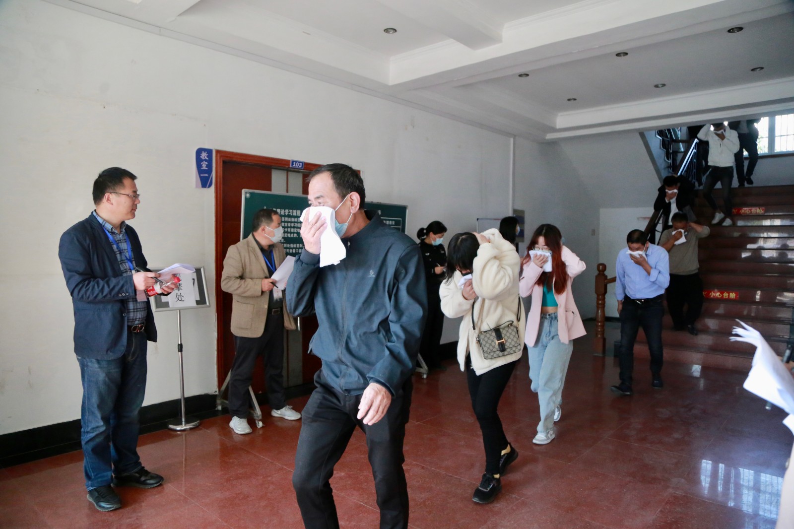随着沃其洪校长宣告演练开始,急促的哨子声开始响起,驾校工作人员第一时间迅速到位,协助驾校在读学员排队撤离。学员们弯着腰,护住头,沿指定楼梯,从应急出口快速、有序地撤离到空地处。