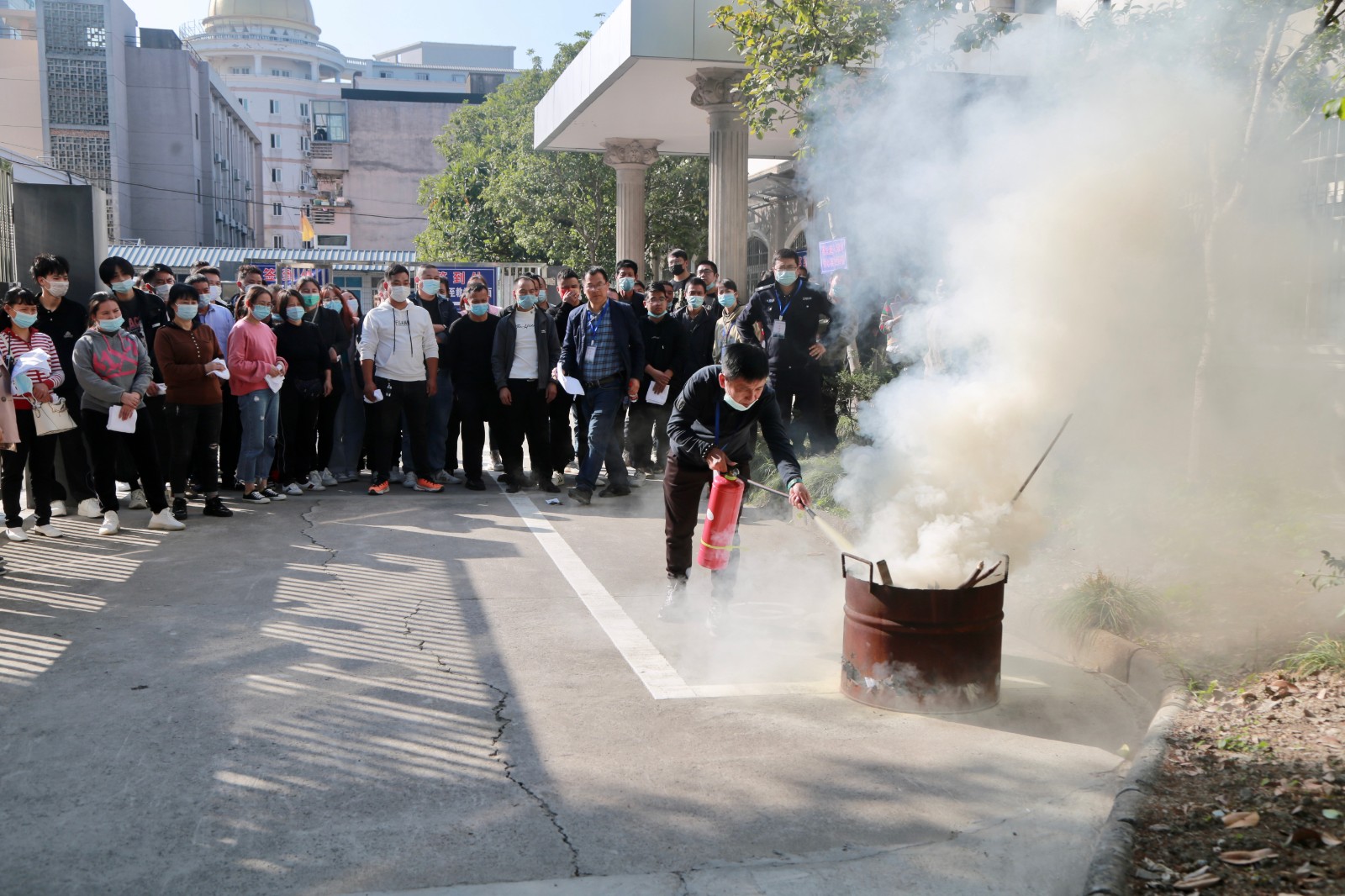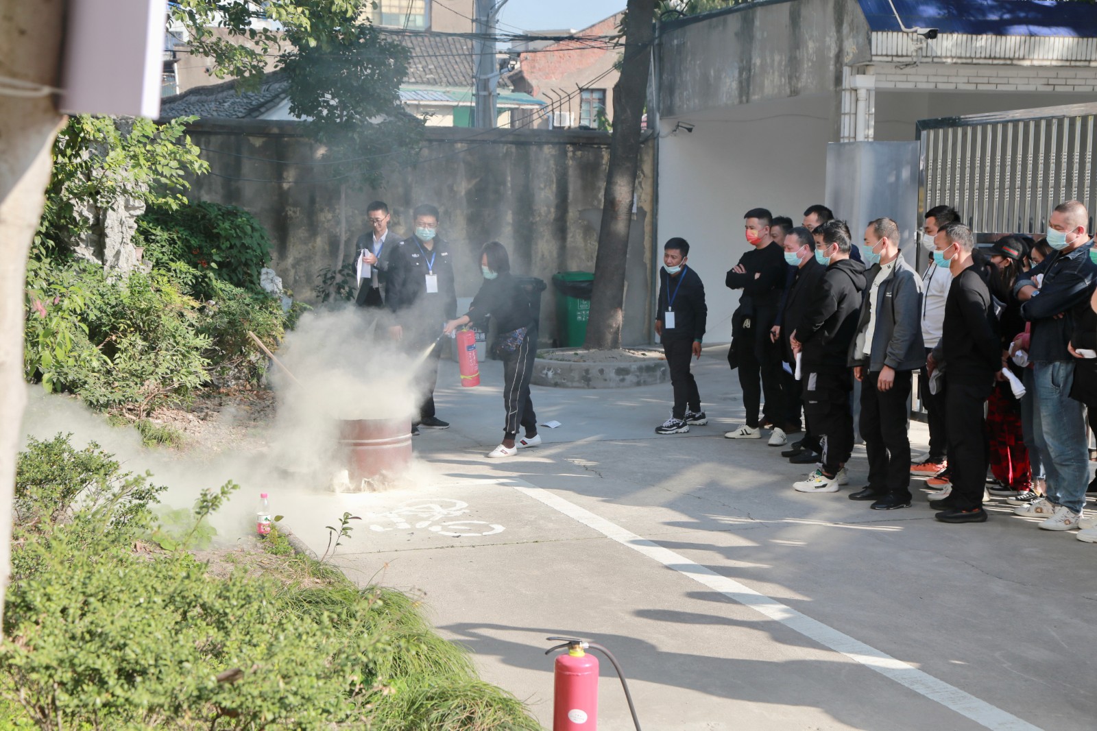 退役消防员钱庆国对学员及工作人员进行了消防安全知识培训,他详细讲解和示范了灭火器的正确使用方法。在场人员积极参与互动,亲身体验了消防灭火的过程。