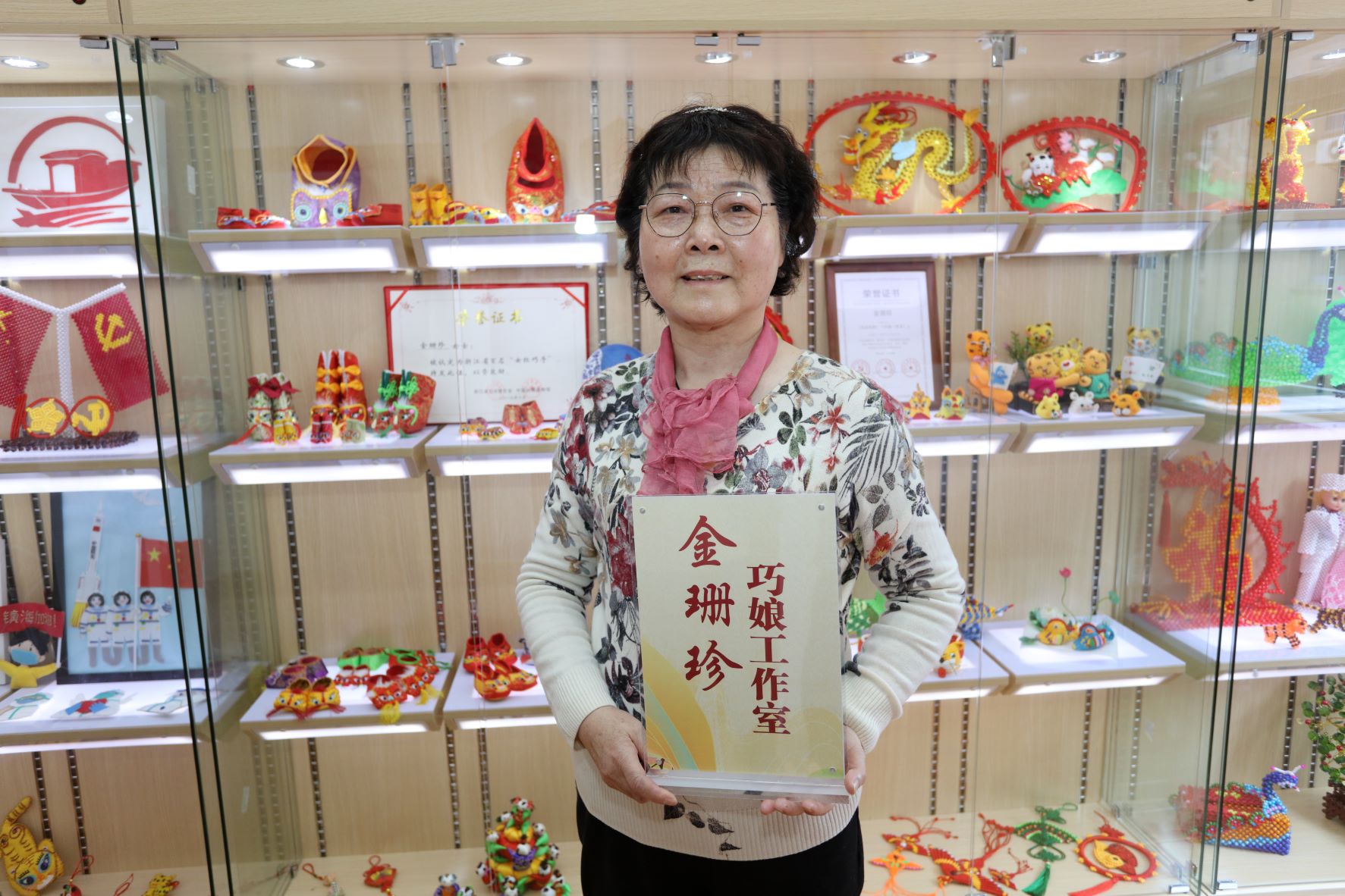 工作室负责人金珊珍,从小受其母亲的影响喜欢女红,擅长制作香袋、虎头鞋、中国结等,自2002年退休后,金珊珍一直致力于各类女红的教学与推广。她制作的作品多次在省市区各级非遗作品展览活动上进行展示并获奖,本人先后获得镇海区女红传人、宁波市非遗项目虎头鞋传承人、浙江省百名“女红巧手”等荣誉称号。2020年,央视东南西北贺新春节目在天一阁录制,金珊珍受邀参加,向全国的观众展示了宁波女红的魅力。