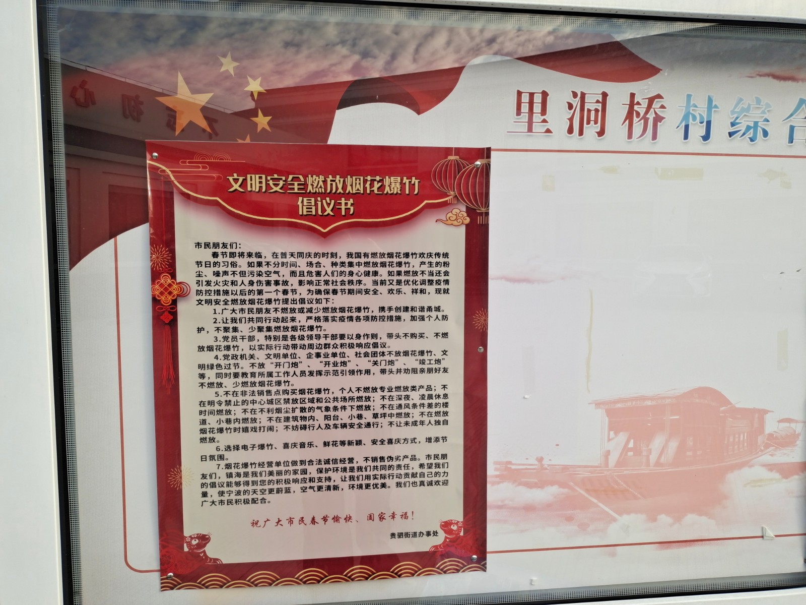 为进一步加强烟花爆竹安全管理,改善城市空气质量,保障公共安全和人民群众人身财产安全深入开展禁燃禁放工作,引导广大群众自觉遵守规定,引导人民群众文明过节,19日,里洞桥村开展禁燃禁放烟花爆竹宣传活动。