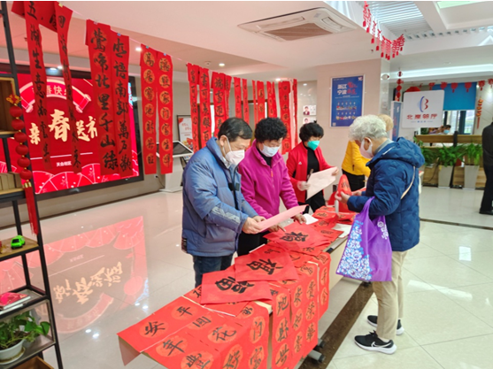 1月13日上午,老年大学书法班的书法爱好者们早早来到社区大厅,把提前写好的春联布置在活动现场,新年喜气洋洋的气氛扑面而来。大家一边挑选着心仪的春联和“福”字,一边互道祝福,也有居民跃跃欲试,参与到书写的行列中来。