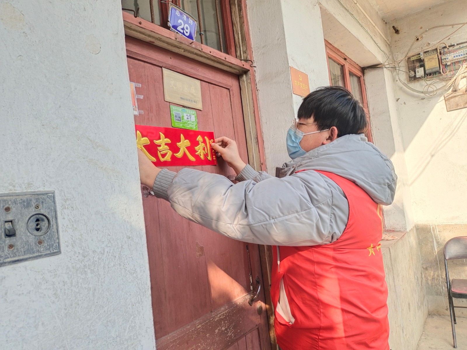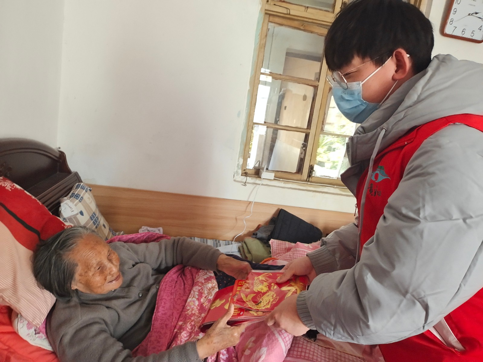 大家到达张奶奶家的时候,张奶奶正在休息,看到我们的到来,露出了开心的笑容。我们给张奶奶送上春联、福字,送上了新春祝福后,还仔细询问了的身体状况,叮嘱要注意身体,注意家中的通风,出门要做好防护,不要着凉,不要去人多聚集的地方。随后我们为张奶奶家贴上了春联。