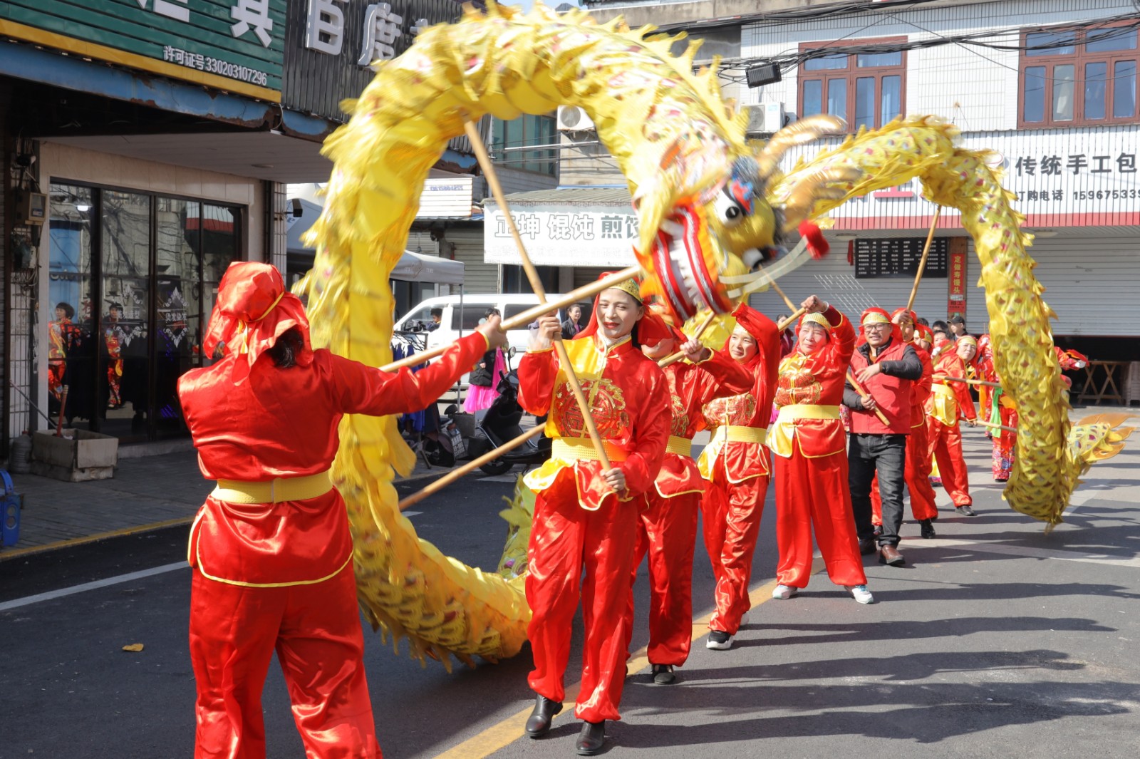 回龙村村民组成的龙鼓舞队伍,喜气洋洋,在打鼓隆隆声中,走街串巷。他们舞动手中的金龙,敲起腰鼓,祈祷新的一年风调雨顺。所到之处,村民纷纷走出家门,一起鼓掌欢呼,更有爆竹,喜迎“龙头”。不少村民纷纷自发跟在队伍后面,拍照留念。