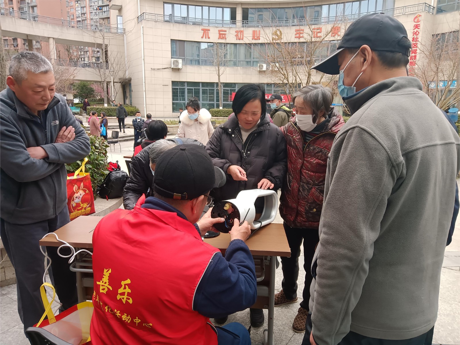 活动当天,天气晴朗,太阳暖洋洋的。天沁社区门口小广场上挂上了鲜艳的横幅“志愿者大篷车进社区”,横幅下,一个个志愿服务摊位前排着队,人来人往。一共有8个服务项目,都是居民朋友们需要的:磨刀、理发、修伞、修理小家电、毛衣去球、搪瓷修补、量血压和牙科检查。活动一直持续了2个小时,有200多个居民享受到了志愿者们贴心热心的服务。
