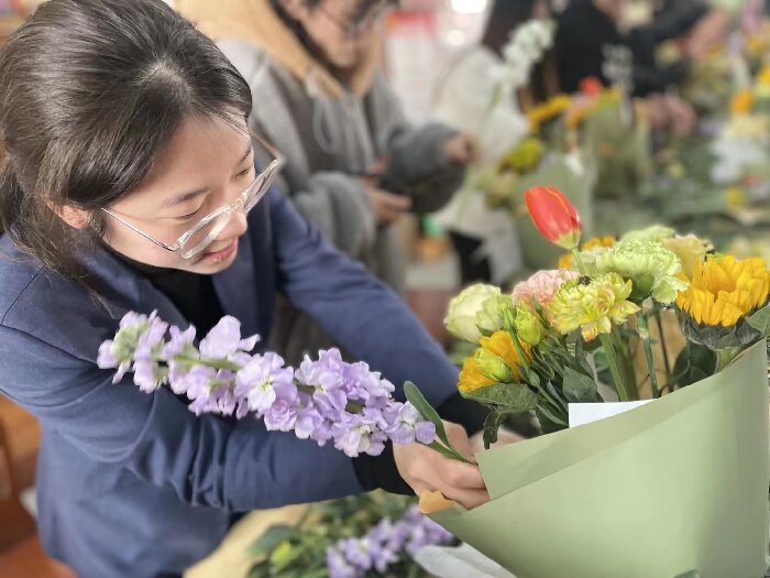 花艺老师在现场细致地讲解了插花的基本知识和技巧,带领大家辨认了各种花材和插花器具。在实操环节,学员们针对手中的花材特点,从鲜花的取材、剪叶、构图、布局开始,不断进行尝试,忙得不亦乐乎。约2小时后,一件件错落有致、生机盎然、创意十足的插花作品展现在众人眼前。