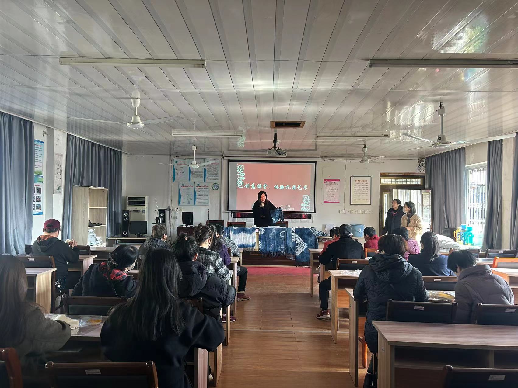 2月28日上午庄一社区特邀扎染艺术老师来社区分享民间扎染艺术的起源与文化,教授居民如何扎染。