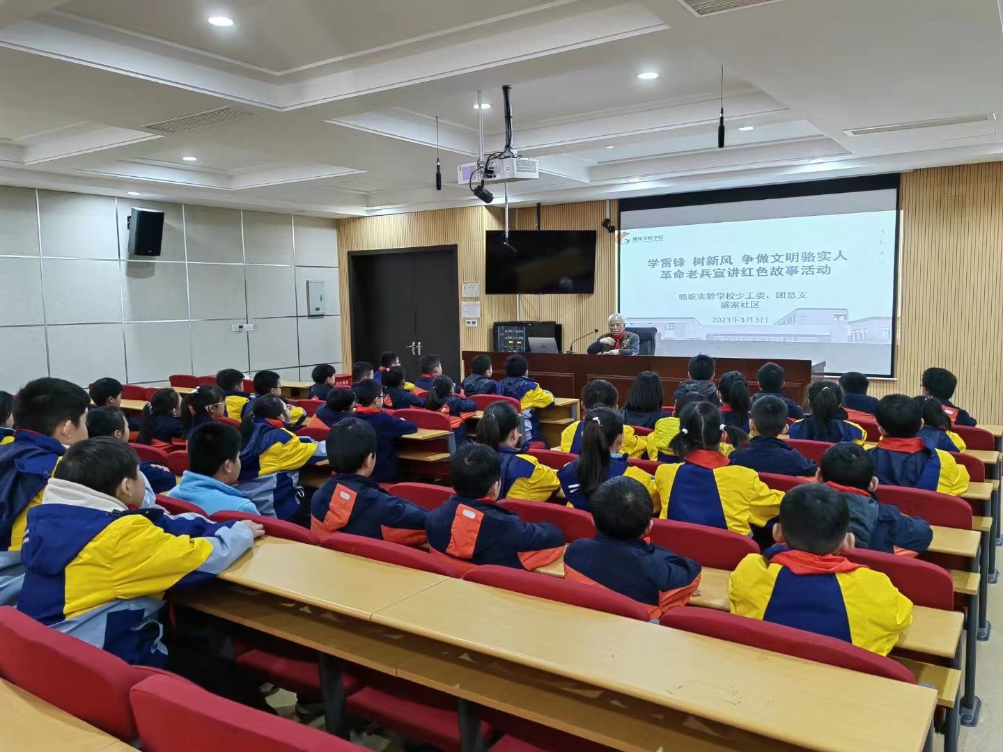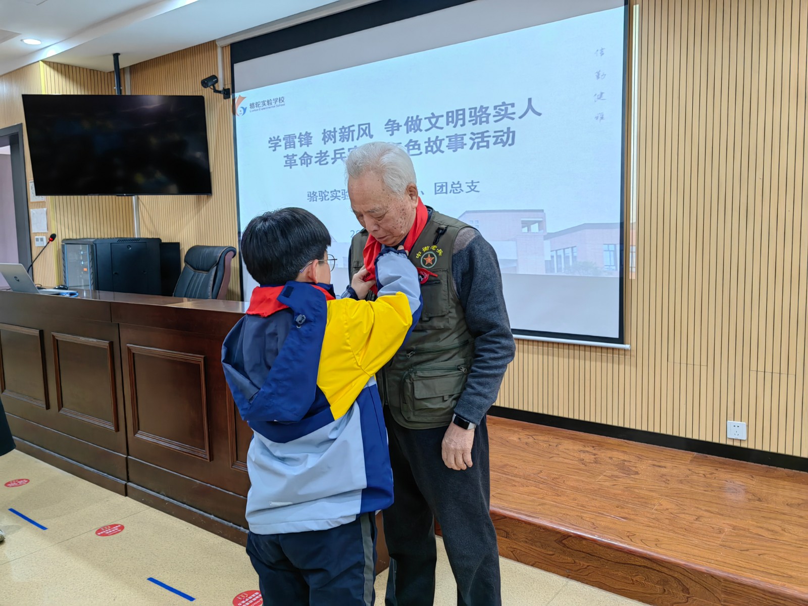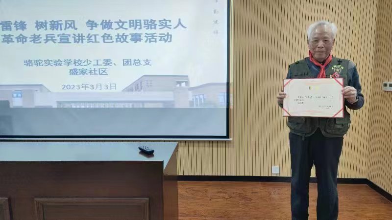 中街社区退伍老兵汪文浩应邀参加骆驼实验小学举办的“退伍老兵话雷锋,红色精神久不息”的学雷锋活动。小朋友们佩戴上学习雷锋的胸章,又为退伍老兵汪师傅带上学习雷锋的徽章,戴上鲜艳的红领巾。85岁高龄的汪师傅在讲台讲述雷锋的感人故事以及自己的参军的艰苦经历,孩子们听的认真投入,老兵讲的动情感人。随后,汪师傅将带来的压是缩饼干分给孩子们吃,告诉他们,以前没有这么好吃的干粮,只有冻土豆炒面,甚至吃野菜树皮。孩子们十分动容,甚至主动将红领巾整理的十分整齐,以表示自己对如今来之不易的生活的敬重,更在心里埋下了“为人民服务”的种子。