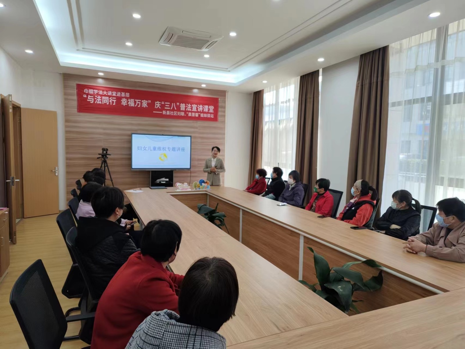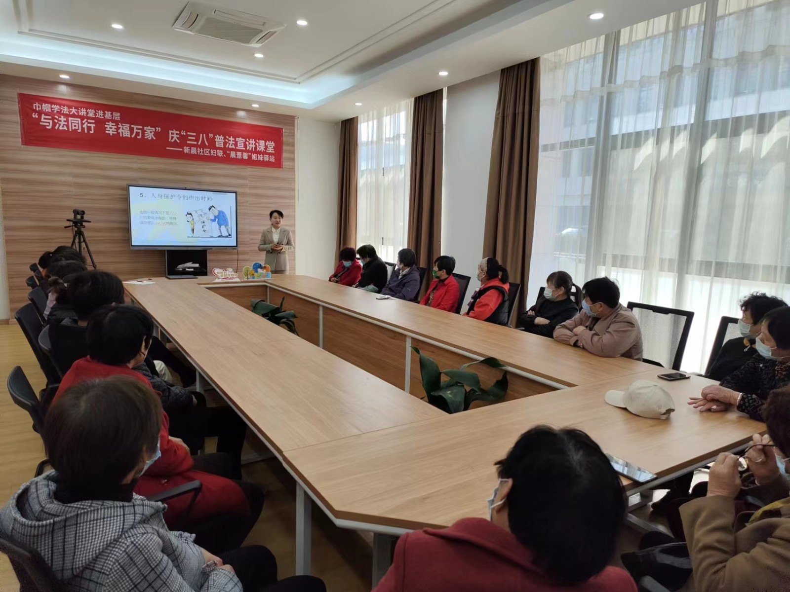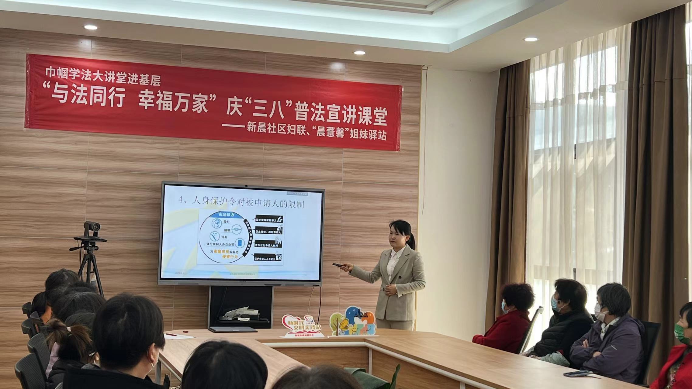 为迎接“三八”国际妇女节,进一步关爱妇女,增强妇女同胞法治观念及维权意识,提升她们知法、懂法、用法的能力。36午,新晨社区妇联开展以“与法同行 幸福万家”为主题的妇女儿童维权法律知识讲座,倡导广大妇女勤学法律知识,善用法律武器维护自己的合法权益。