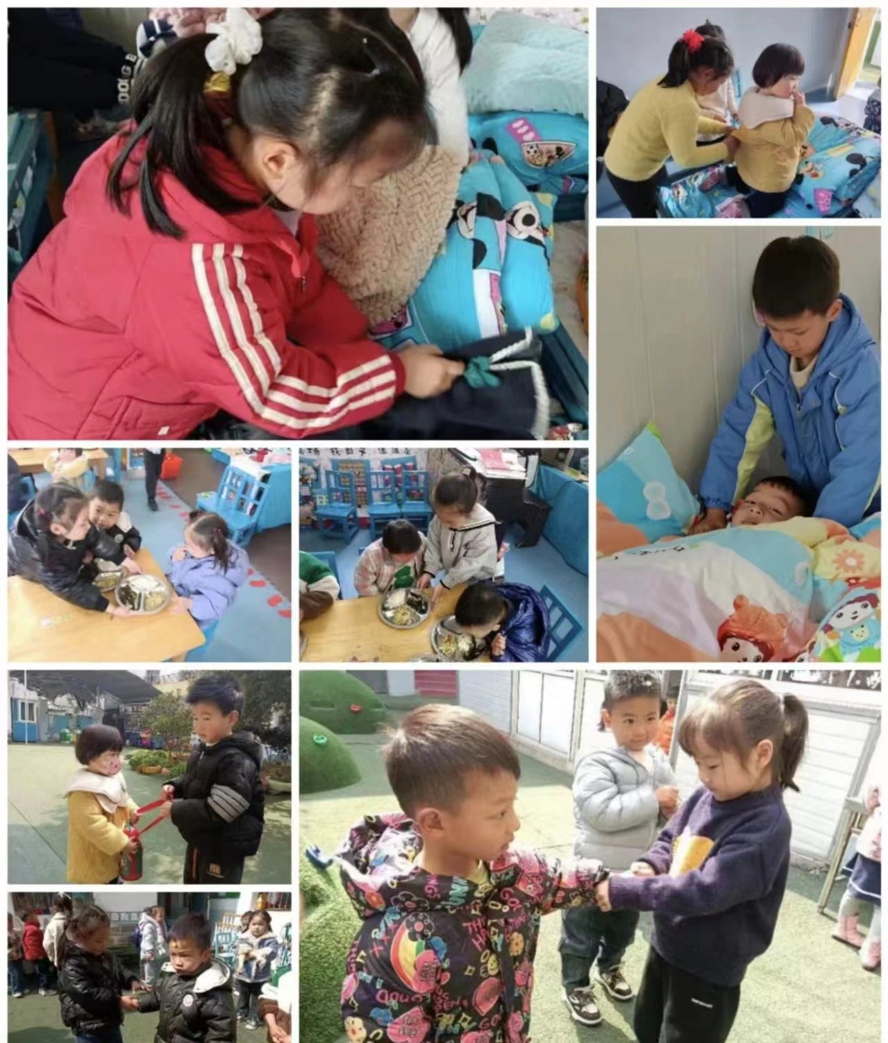 瞧,他们纷纷表示要向雷锋叔叔学习,个个争做小小志愿者,帮助弟弟妹妹们, 不怕苦,不怕累,拿起小抹布,玩具的细缝都不能放过,必须擦得亮亮的,感受劳动的乐趣。帮老师整理区域材料喽,感受一下当“小雷锋”的快乐。帮弟弟妹妹洗洗手,给可爱的弟弟妹妹喂饭, 给弟弟妹妹们穿脱衣服,感受奉献自己力量的快乐。横河镇实验幼儿园的小天使们,用自己小小的身躯做着自己力所能及的事,尽其所能为幼儿园的环境增添温暖的色彩。