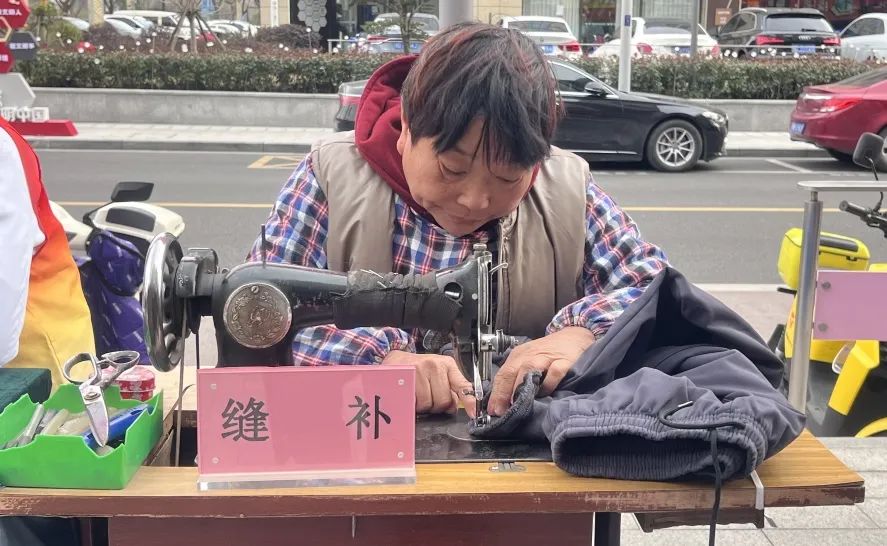 居民带上剪刀、菜刀、需要修补的衣物有序地在摊位前排队。“ 现在磨刀师傅真不好找,家里刀钝了肉也切不动,现在有了磨刀服务可解了我们燃眉之急!”居民由衷感叹到。