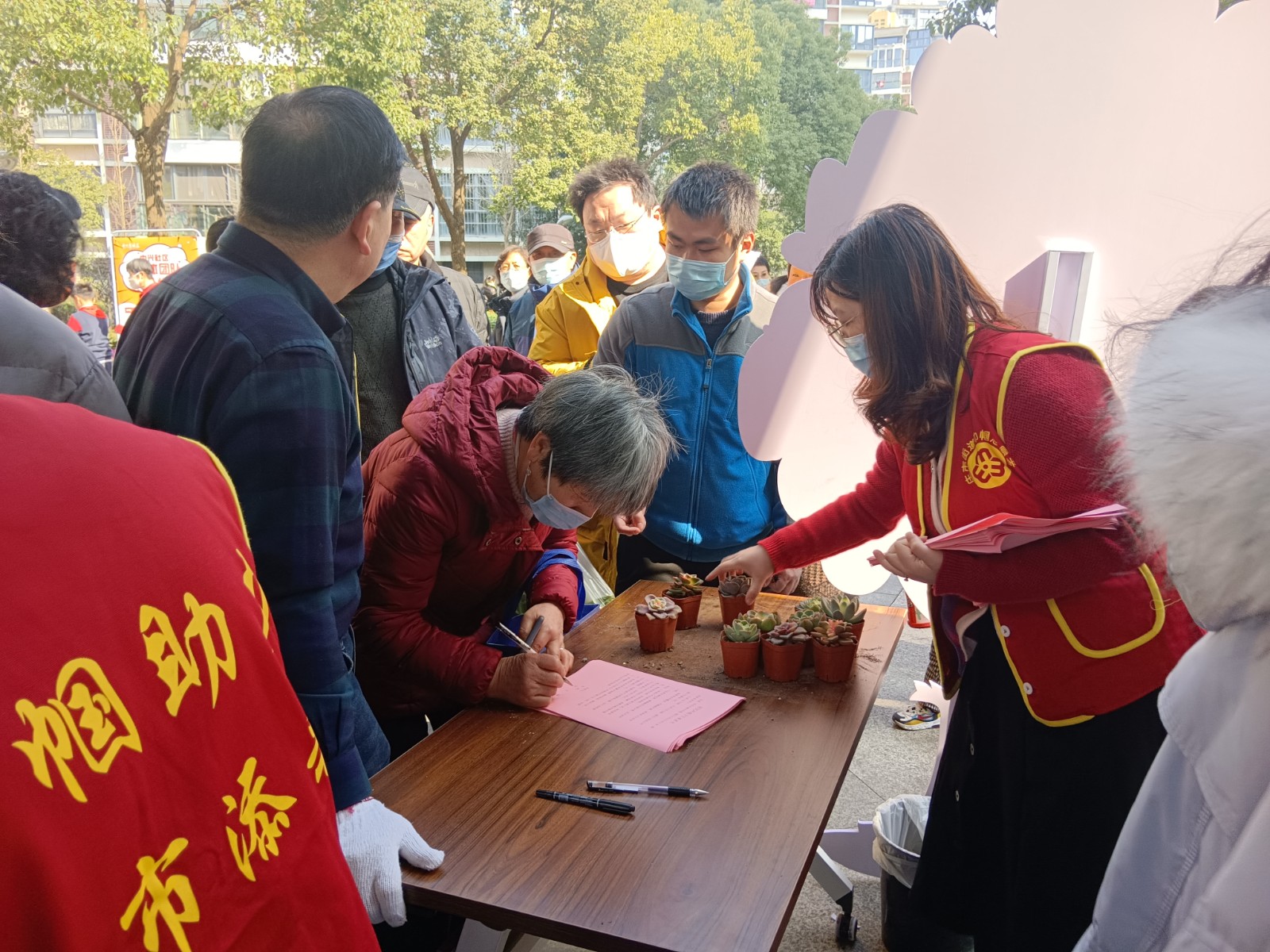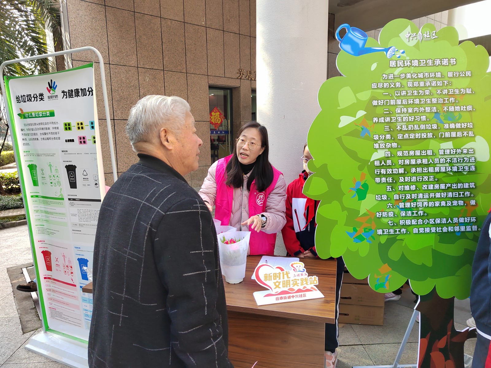 为响应即将到来的植树节,中兴社区于3月4日开展植树节系列活动,活动现场设置了“浇”个朋友和美丽庭院摊位,“浇”个朋友为了号召居民签署门前三包承诺书,希望居民更加自律、更有责任心的去保持家门前卫生的整洁。美丽庭院活动主要是为了让居民们展示自家庭院或阳台的绿植照片,辖区内的阿姨们在了解活动规则后,纷纷赶往各自家中,争着抢着想要展示自家阳台的美丽一角,一边炫耀着一边还不忘顾着排队,先要抢先占有精美绿植。