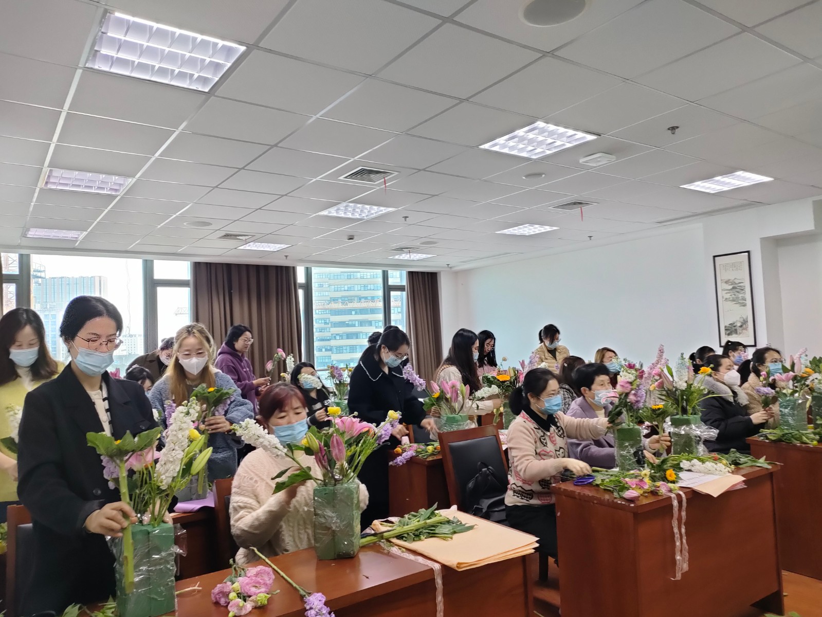 活动中,金晶老师向大家讲解插花技巧和色彩搭配,让大家了解插花的基本知识和方法。在金老师耐心地指导下,大家认真地修剪枝叶、构思造型,并在现场完成了自己的作品。动手创造的过程充满着成就感和幸福感,大家以花相聚,保持对生活的热爱,表达对未来的美好期许和憧憬。