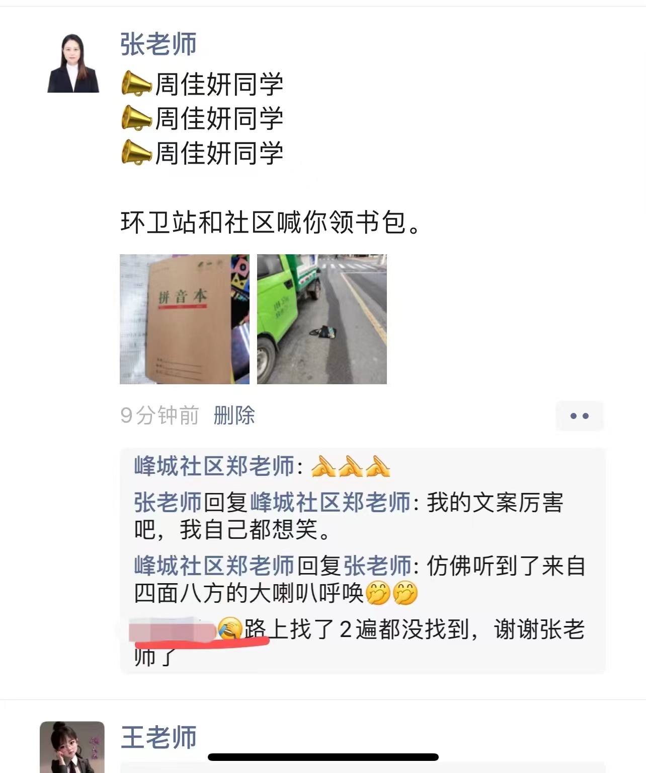 社区工作人员立马将布袋里的作业本拍照,然后将照片发到各个微网格群、朋友圈,让大家一起帮忙,“周佳妍同学 周佳妍同学 周佳妍同学 环卫站和社区喊你领书包!”峰城社区融合性社会组织成员张小燕的朋友圈文案更是让人忍俊不禁。短短半小时,依靠强大的微网格群和朋友圈,就找到了失主,并与社区约定了时间前来领取布袋。