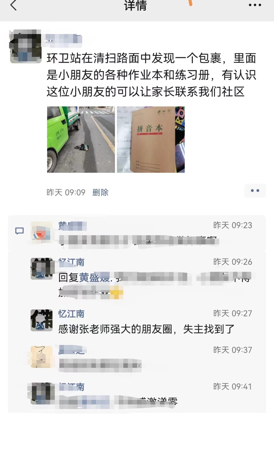 原来当时这位家长带着小朋友着急忙慌的赶着去上课,电瓶车一路颠簸将布袋震到地上了也没发现,结果到了学校才发现装作业本的袋子不见了,当时真是急的满头大汗,然后有家长说好像XXX的朋友圈看到过失物认领,让这位家长去问问,当知道孩子的作业本练习册是被环卫站捡到放在社区后,终于松了一口气。