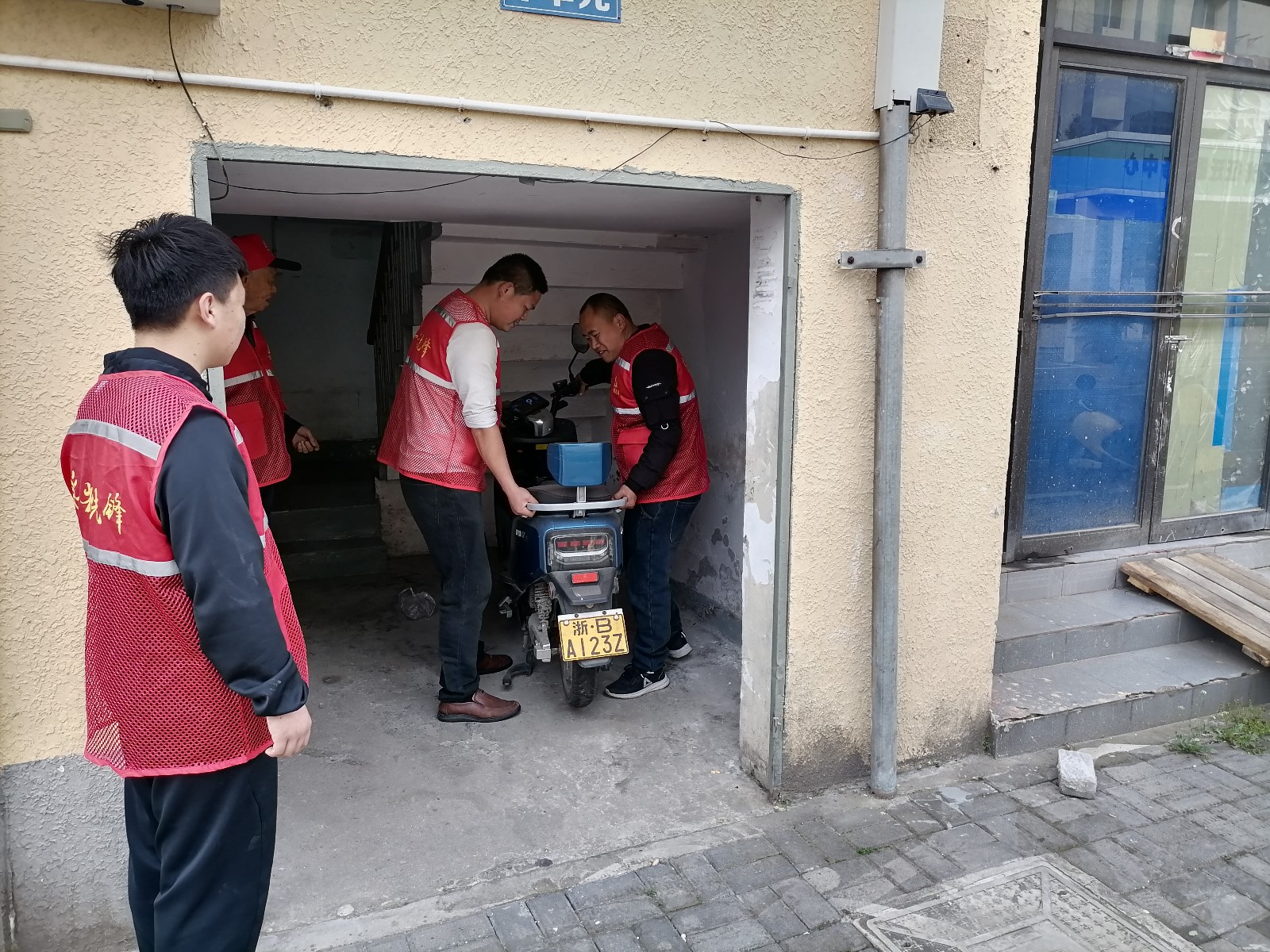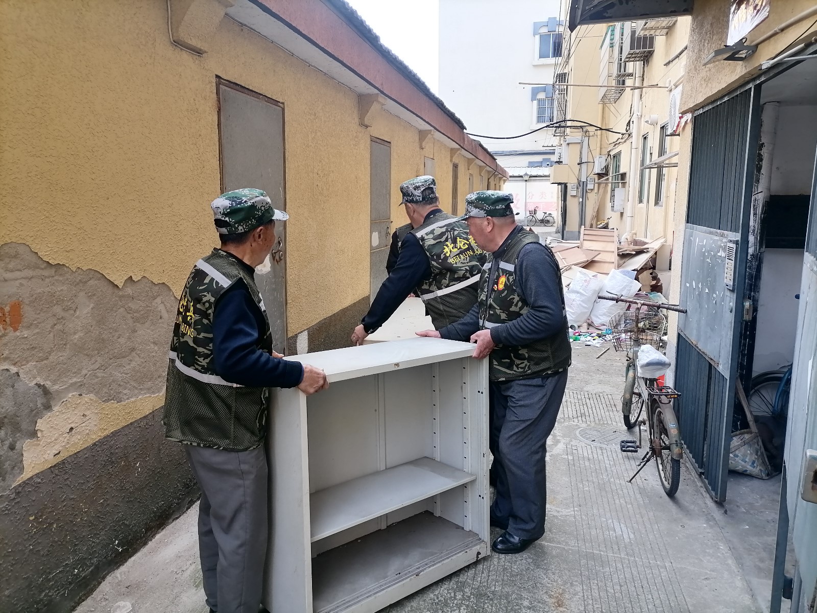 在巡查清理过程中,发现有两辆电瓶车停放在楼道口,而且正对着灭火器,考虑到存在安全隐患,社区党员志愿者当机立断先将电瓶车放到安全区域,再由社区工作人员联系上车主,对其进行劝说,告知其危险性,为了楼幢居民的安全,请务必将车子停在指定处。老兵志愿者更是干劲十足,对小区内的楼幢道路进行“地毯式”清理,看到因为住户家里装修暂时放置在楼道口的柜子、杂物,劝导后就撸起袖子将柜子扛走放到大件垃圾投放处。