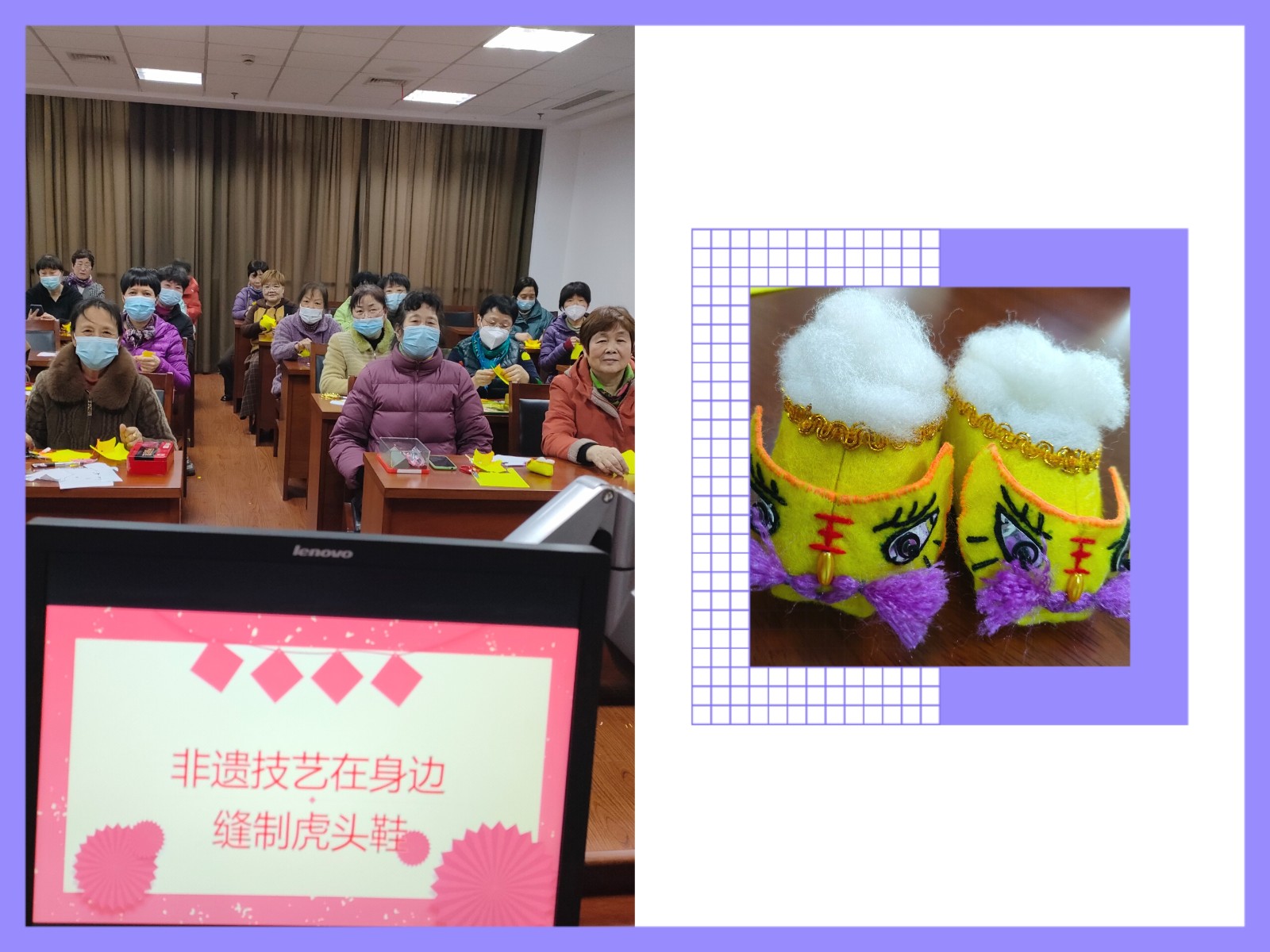 虎头鞋制作技艺已被列入中国非物质文化遗产。它既有实用价值,也有观赏价值,自古就被人们赋予它驱鬼辟邪的功能。3月15日下午,在庄市成校开展“非遗技艺在身边 缝制虎头鞋”活动,本次活动特邀请王凤老师为辖区居民教授虎头鞋传统技艺。