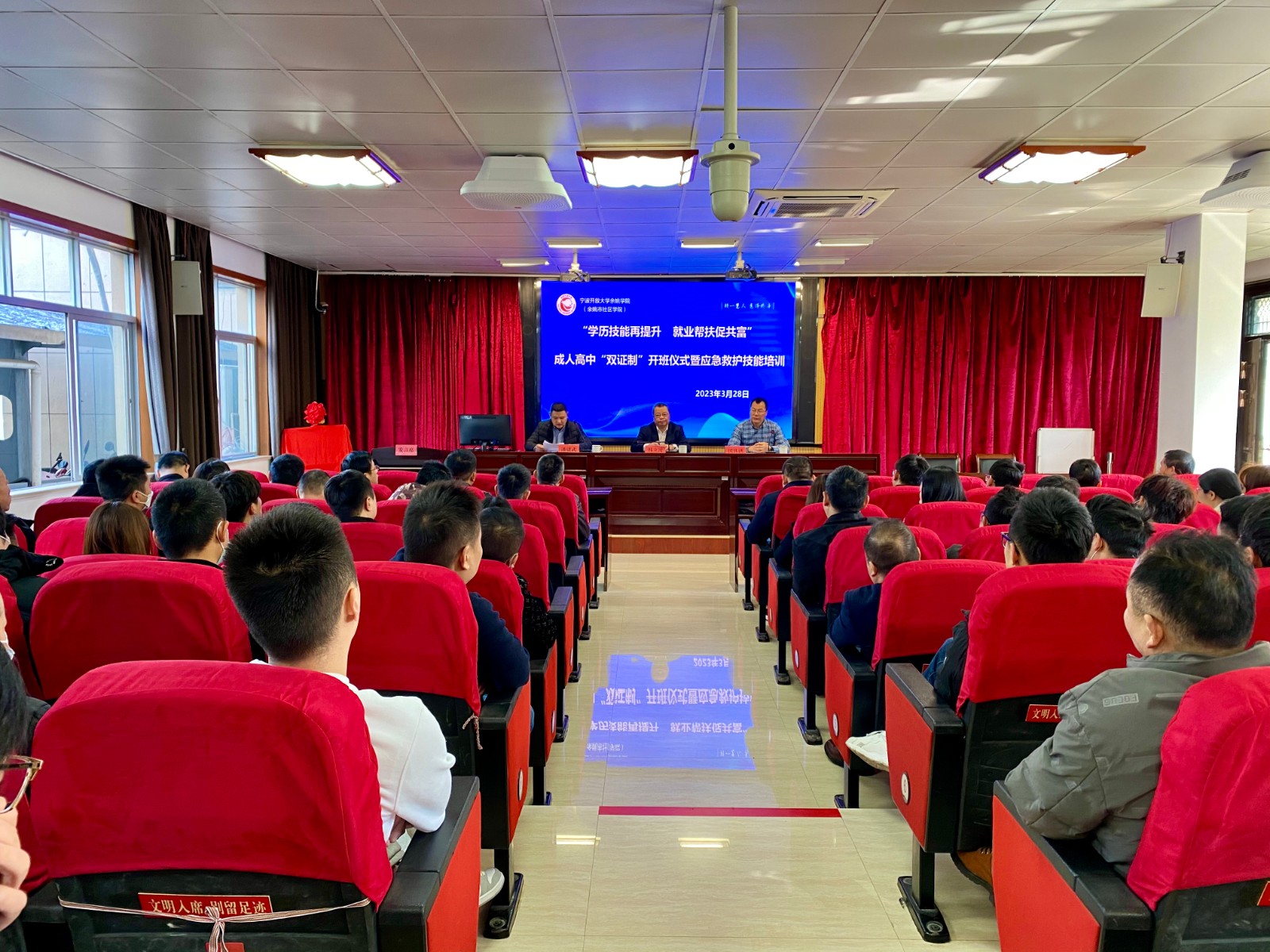 328日上午,宁波开放大学余姚学院余姚市社区矫正中心教学点揭牌成立,由余姚市司法局与宁波开放大学余姚学院(社区学院)合作办班的“学历技能再提升、就业帮扶促共富”“双证制”成人高中开班仪式暨应急救护技能培训在宁波开大余姚学院一楼报告厅举行。余姚市司法局党组成员、副局长韩立波,宁波开大余学院书记、院长沃其洪出席开班仪式并致辞,司法局社区矫正管理局局长潘建武主持。市各乡镇街道司法所所长宁波开大余姚学院、搭把手培训学校、红盾社会工作服务中心相关工作人员、老师以及学历技能“双提升”的70余名学员参加此次开班仪式。
