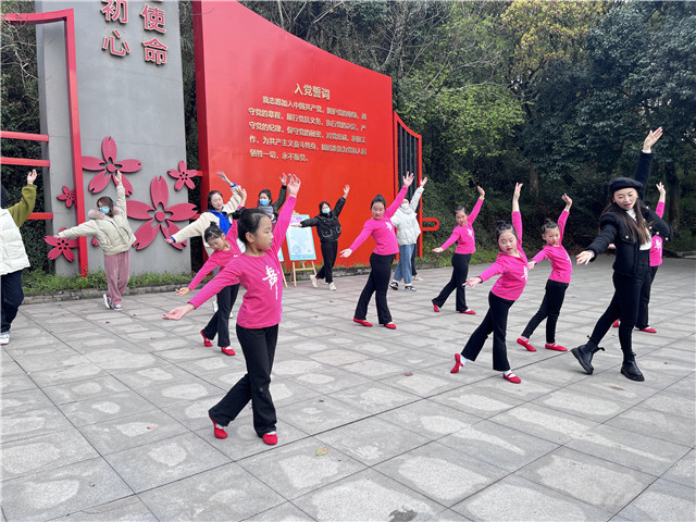 来自社区的20余名青少年居民代表汇聚于此,用登高健身的方式,迎接新的一年春来时,共同欢庆杭州亚运会的到来。从万景山广场出发拾级而上,居民呼吸着清新的空气,远离平日里的喧嚣。途径胡焦琴烈士墓,登顶而上便是文昌阁,居民们凭栏远望,往东北方向可远眺芦江河穿过穿山碶奔腾入海,往南则是繁荣热闹的城镇街巷。