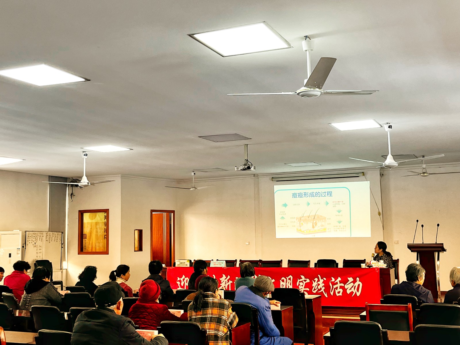 人间最美三月天,春花烂漫展新颜。3月31日下午,迎周村新时代文明实践站特邀龙赛医院副主任医师王芳老师为辖区老年人开展面部常见皮肤病的治疗与美容讲座。王医生结合临床经验,从皮肤衰老的内因和外因、皮肤衰老的表现、色素痣相关问题、常见皮肤病防治及皮肤类型及护肤品等方面,强调了关注自身皮肤状态,做好病变防控,如有疑虑应到正规医院筛查并及早治疗。