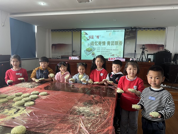 “这些艾草都是我们去附近的山上采摘来的,新鲜的很!清明节我们都有习俗做青团祭祖先呢!”活动中,经验丰富的阿姨们带着小朋友们一起制作青团,一边动手示范,一边跟小朋友们讲述清明节的民俗故事。阿姨们熟练地拿起一团面团进行揉搓,揉成一个圆形后捏成饼状,随后用汤勺舀起芝麻馅放在中间再慢慢合上封口,最后将面团放在磨具上一压,一个漂亮的青团就做好了。小朋友们看着阿姨们做好的青团,不禁都想尝试自己制作。“超市里的青团都是团状的,这里制作的都是饼状的,上面还有花纹,真好看!”小朋友们在阿姨们的指导下一步一步学习制作青团,制作出来的成品也愈发精致。“我们小时候过清明节的时候,父母都是自己做青团的,我们小孩子跟着大人一起上山摘艾草,用工具捣碎挤出汁水还是很好玩的,那个时候真的是很怀念!”居民骨干胡阿姨看着身边小朋友高兴的样子不禁回忆起过往。