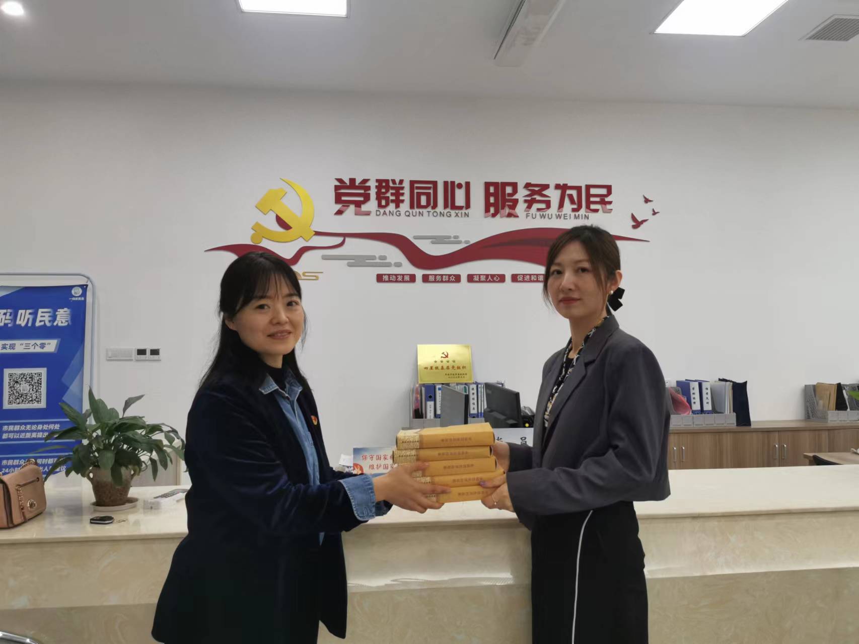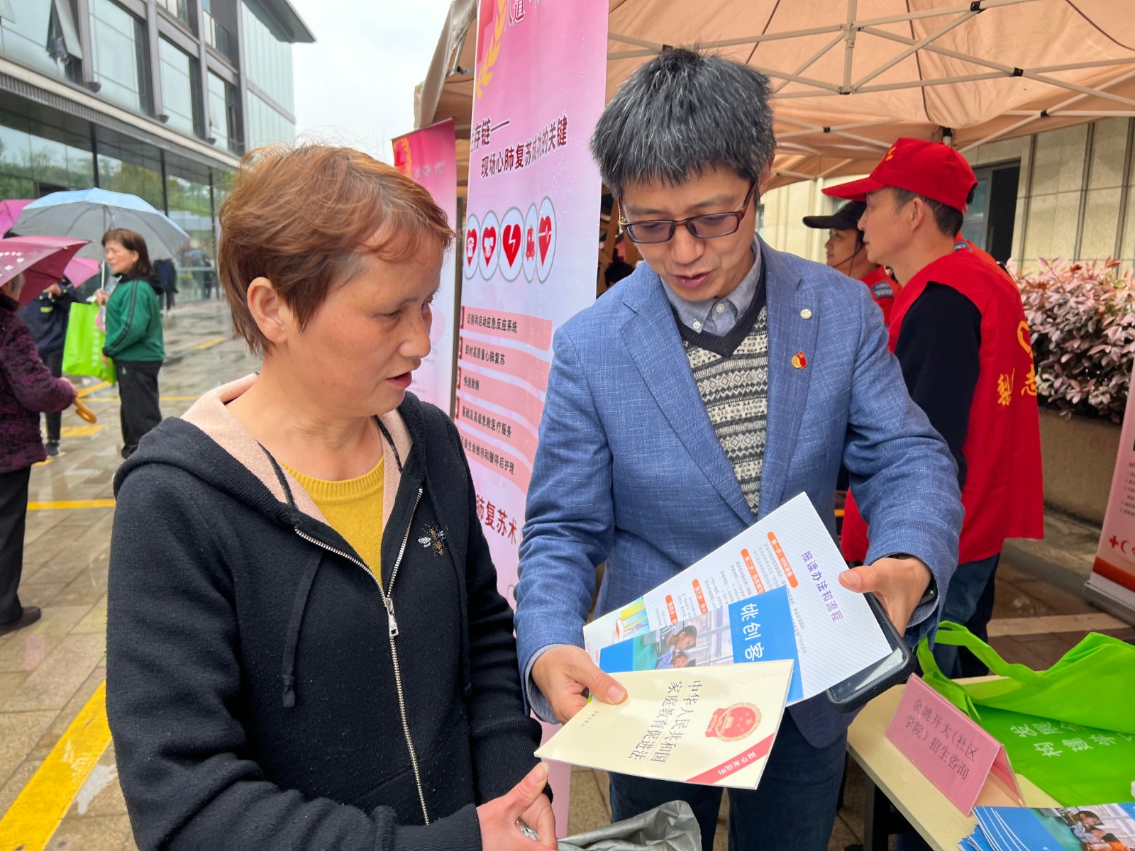 授牌仪式结束后,学院向社区捐赠了20套自编的省社区教育优秀读本《四先贤的故事》,助力社区文化建设。学院支部党员代表在社区开展了“惠民先锋”便民服务暨各类教育培训现场咨询服务,向市民积极宣传全民终身学习理念,发放《家庭教育促进法》、垃圾分类手册等宣传资料,弘扬家庭文明新风尚。虽然活动当天风雨交加,但丝毫没有减弱党员们的服务热情。