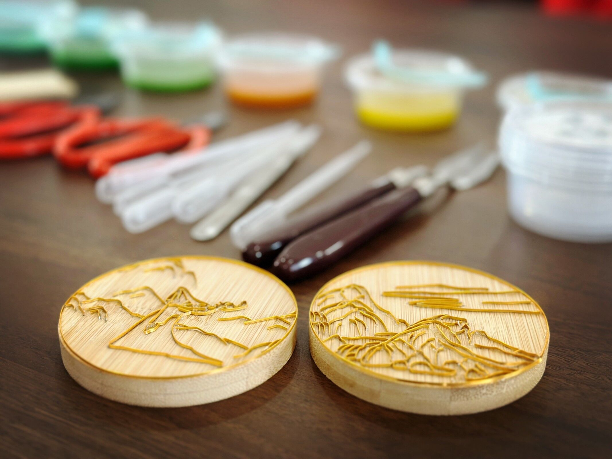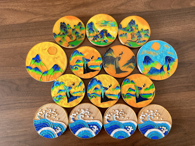 活动现场,网格员生动形象地向大家介绍了掐丝珐琅彩画的起源、历史发展以及现代创新技术等方面的知识,带领大家了解每种材料的用途及使用方法,并教授画稿、掐丝、点蓝、封层等重要技艺。在网格员的讲解下,大家对掐丝珐琅有了深入了解。将金丝剪成适当长度的小段,用夹丝板将金丝捋直,将粘丝胶少量涂在线稿上,再用镊子调试金丝完成一段段图案,用画铲将彩砂填入相应的区域……兰里子、中松黄、明黄、群青、鲜绿,中国传统颜色与中国传统工艺相融合,千里江山,只此青绿,国风宋韵,意犹未尽。