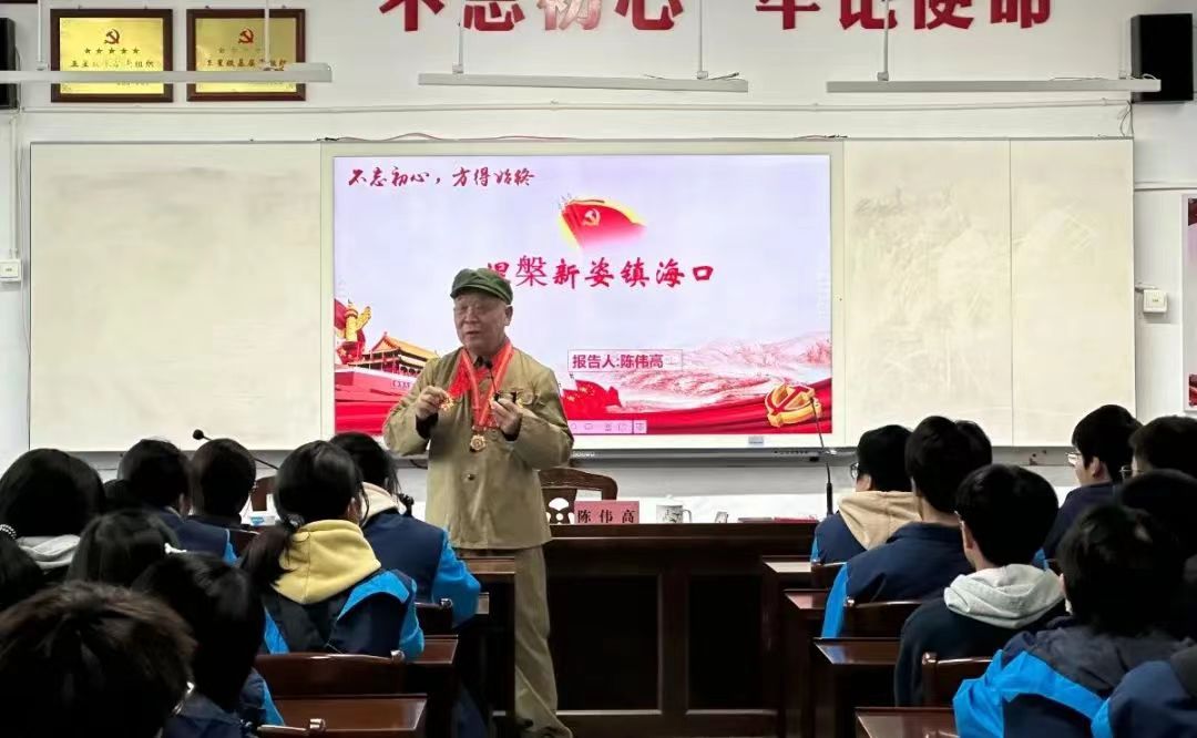 4月14日下午,中街社区关工委联合骆驼中学团委,邀请了浙江省最美模范退伍军人、浙江好人、最美宁波人陈伟高先生在骆驼中学开展红色主题讲座《不忘初心,方得始终——涅槃新姿镇海口》七十七岁高龄的陈伟高先生一身戎装,精神矍铄,目光如炬,他用一个标准的军礼拉开了讲座的序幕。陈伟高先生从自己的人生成长经历入手,用慷慨激昂的声音将师生们带回到了那个战火纷飞的年代。学生们虽未曾经历过那段屈辱历史,但听到陈伟高先生的讲述仍被深深震撼,那段过往历史的照片和文字深深印刻在学生们的心底,久久无法释怀。