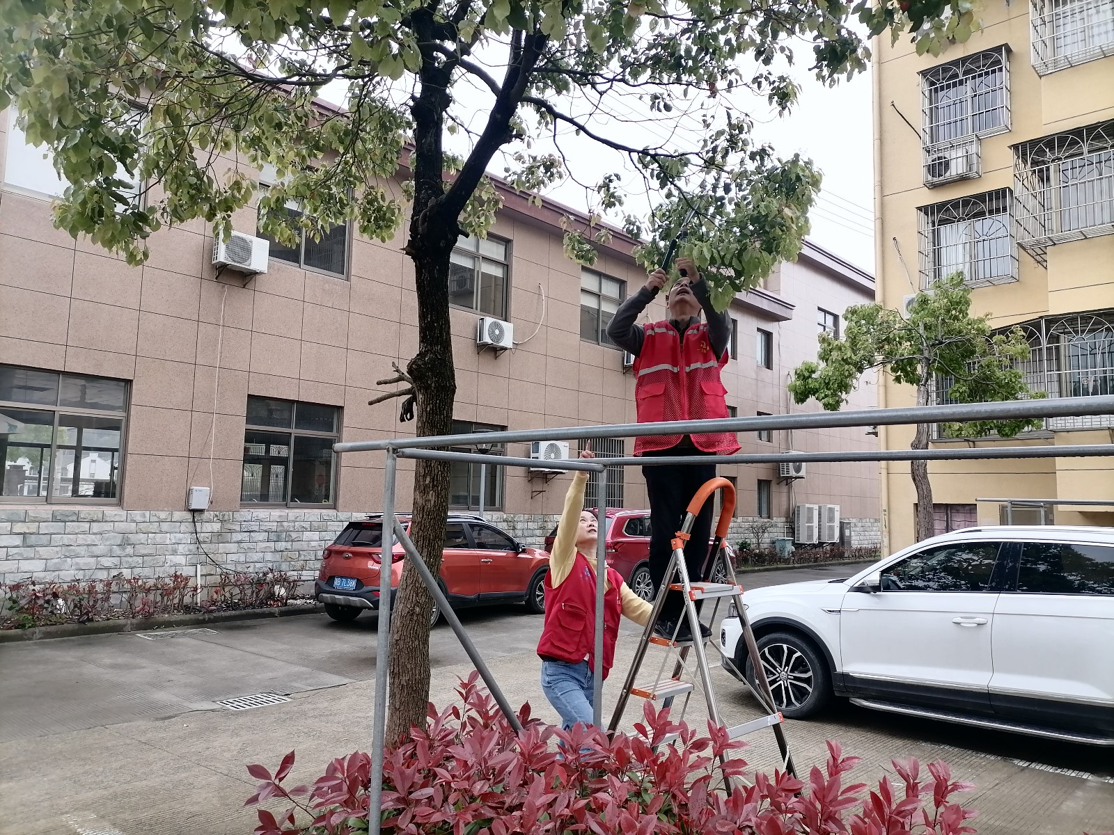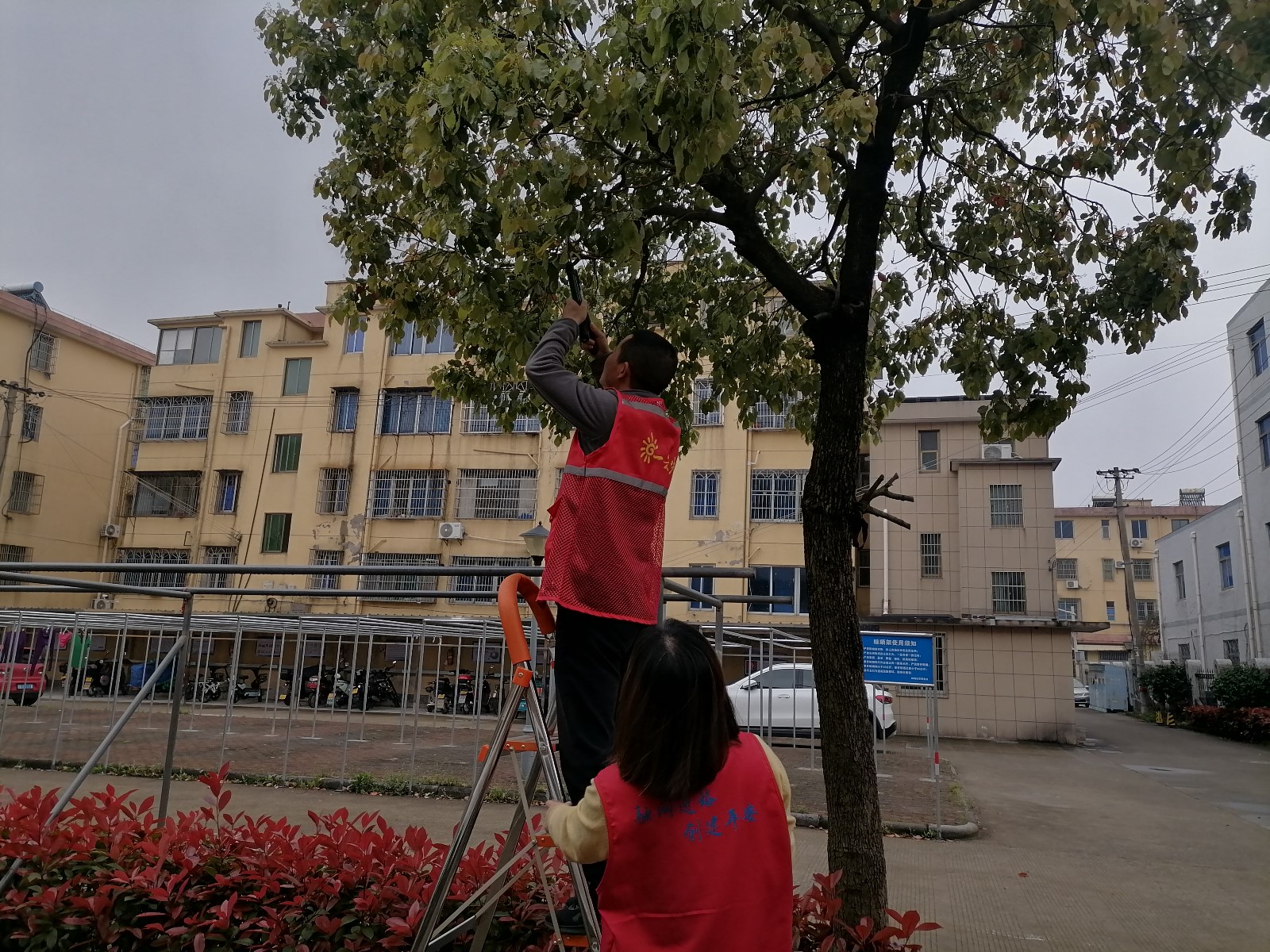 周六上午,社区工作人员、网格员化身为“理发师”,为西小区的樟树末梢“理理发”。他们避开人员、车辆进出的高峰期,开展树木修剪工作,经过一个多小时有序地修整,影响居民晾晒的树枝得到了有效处理,清理后的树枝、树叶也被一同清理干净。同时告诉居民,到时候会有专业的师傅进场对过高的树枝再次进行修剪,让他们不要着急。“好和好和,谢谢你们嘞,能把下面的枝叶修剪干净已经很不错了,高处的树叶就让他们专业的人来清理,不然也太危险了。”居民对社区放弃周末休息时间为小区服务的行为表示了感谢。