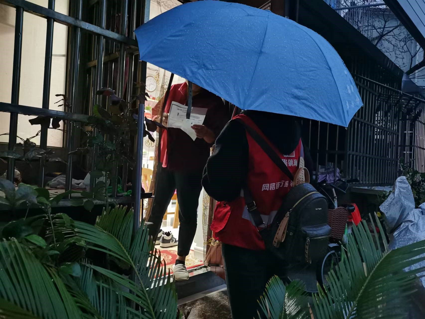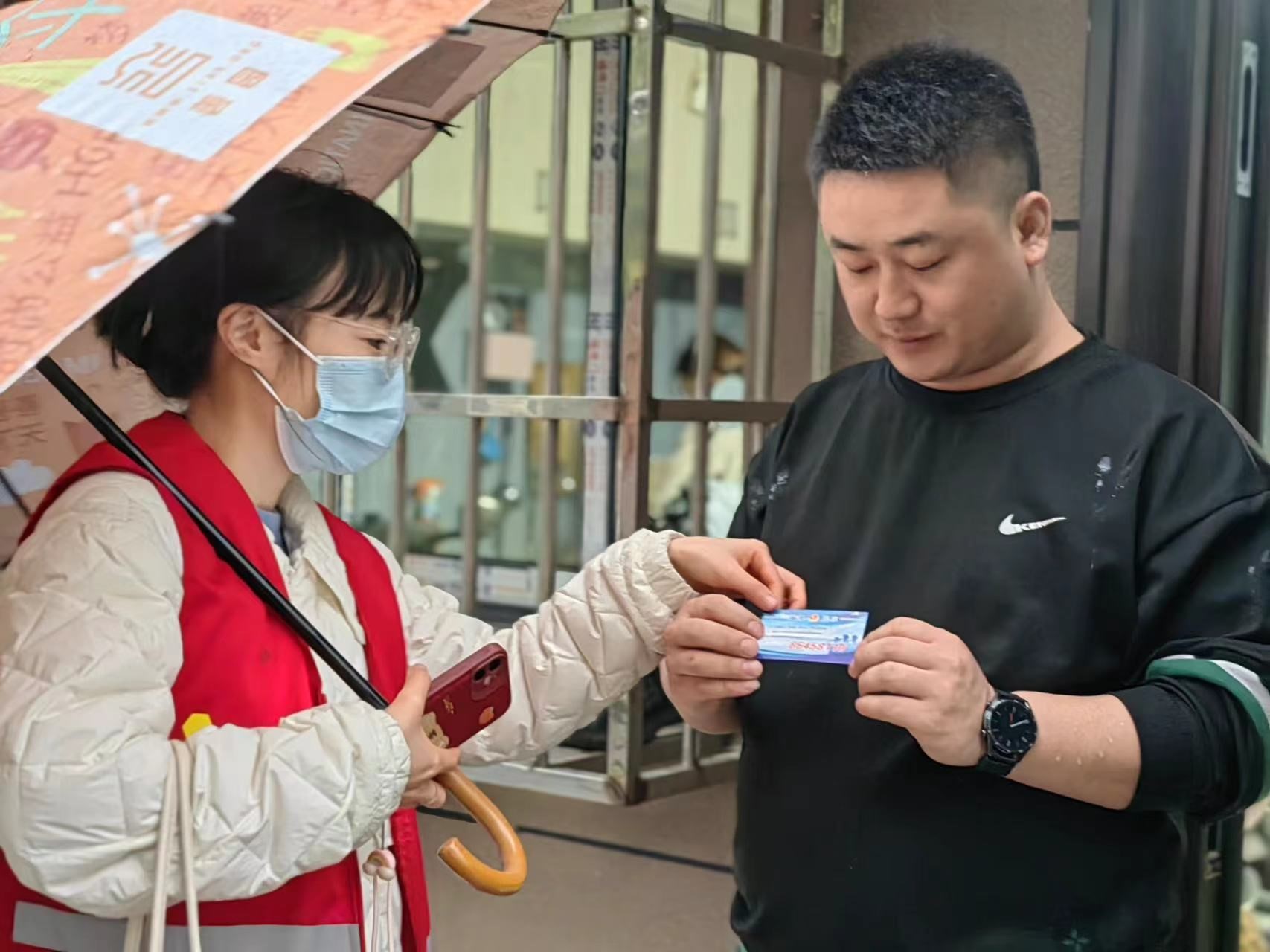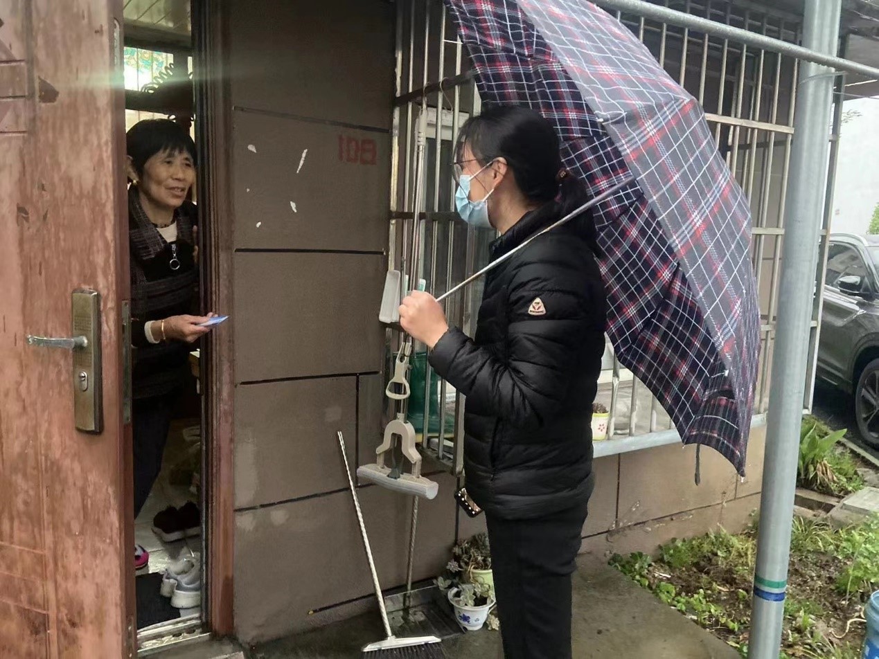 蛟川街道石化三建社区的网格长们身穿红背心穿梭在居民楼中,敲开居民家的门,送上反诈小卡片。