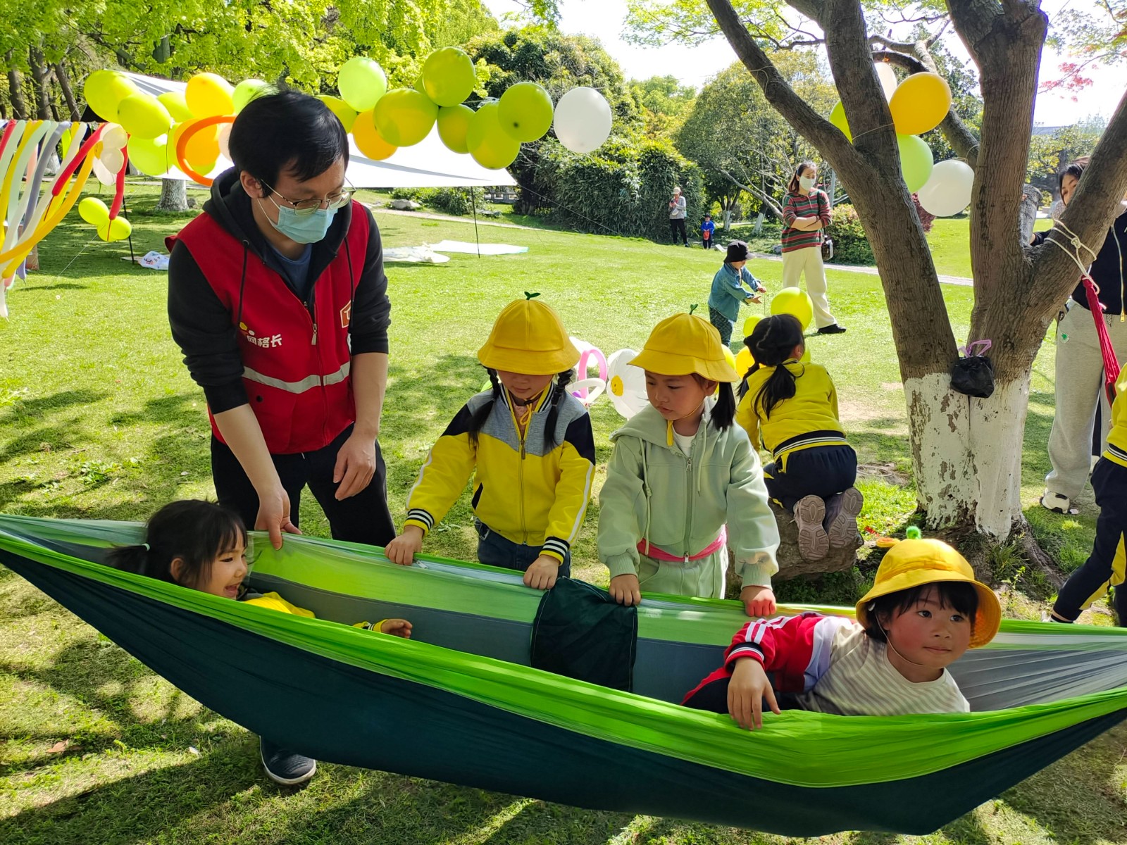春天的脚步匆匆,社区的网格长们同小朋友们一起玩彩虹伞,在游戏中感受色彩,并在游戏结束后,在身边的植物中找到跟彩虹伞对应的颜色,留住春天的颜色。小朋友们坐在吊床上,社区的“临时奶爸”网格长江阳推动吊床,在树荫下感受春风拂面的气息。一起玩打地鼠的游戏,在奔跑中寻找春日暖阳的快乐。一起捡树叶,装进自己的口袋,用标本留下春天的印迹。