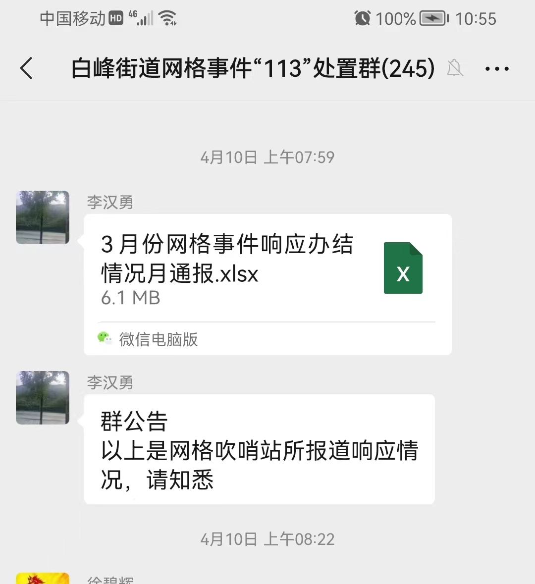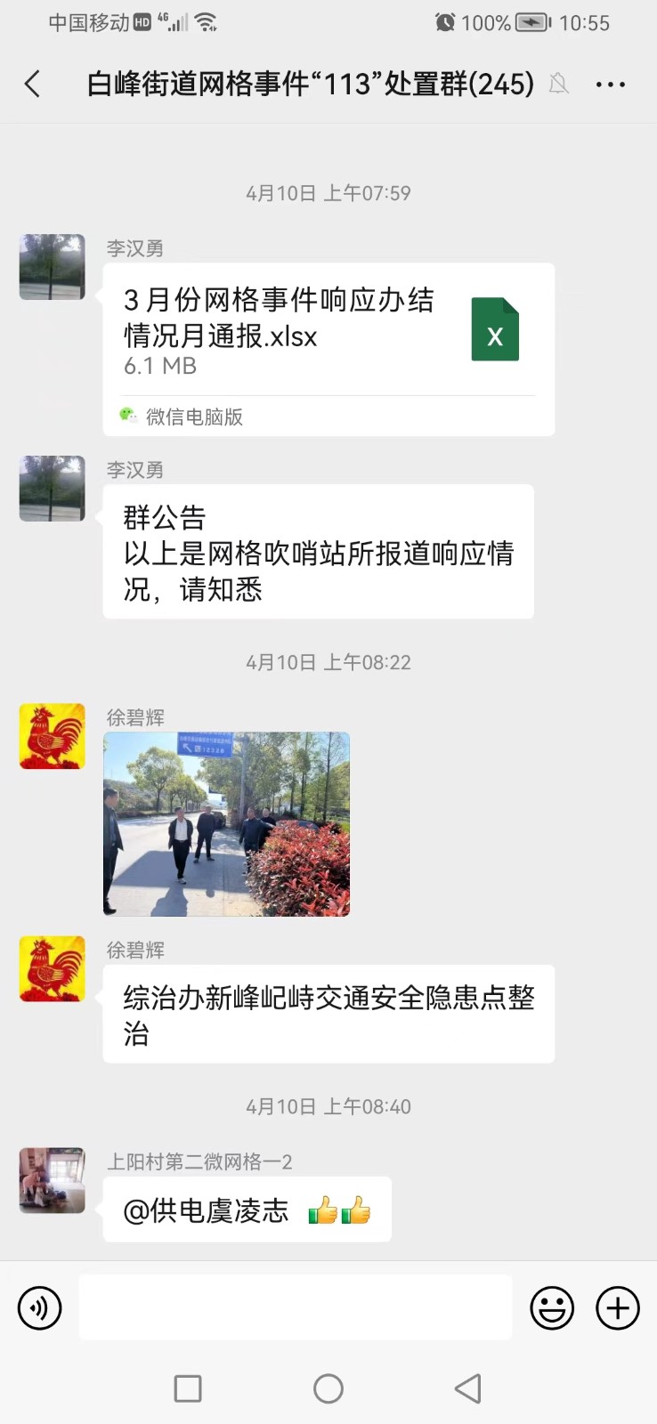 “牛头山路红绿灯处智能交通信号机后盖损坏了。”“收到!”“现已修复。”“感谢!”在白峰街道网格动态事件处置群里,每天都能收到3-4起网格员排查上报的安全隐患问题。今年伊始,白峰街道设置网格动态事件处置“113”机制,既网格员发现问题上报吹哨,综合信息指挥室一分钟之内建单流转,各科室站所一分钟签单应哨,综合信息指挥室三天之内对单销号,从发现问题到解决问题形成“闭环”,打造基层治理一张网,让居民群众家门口的烦心事、操心事马上办、有人办,而且能办好。