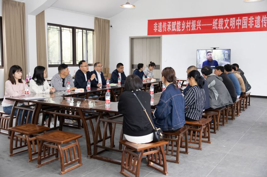 研讨会上,非遗传承人袁建增对各位专家学者的到来表示衷心感谢介绍了棠岙古法造纸文化中心基本情况及棠岙造纸技艺的历史和工艺流程,并希望大家多提宝贵建议作为浙江省非物质文化遗产项目基地古法造纸体验中心在致力于古法造纸的保护传承与创新发展的同时,可以利用自身技术和资源优势,整合丰富的旅游资源,充分利用村内保留完好的古法造纸手工作坊,开发精品研学旅游线路及新产品,带动村民就业;研发古法造纸新产品,提高纸张质量和纸张的经济价值,精心改良、批量制作出应用性更广的书画专用会纸,提高产品竞争力、增加村民收入,助力乡村振兴。