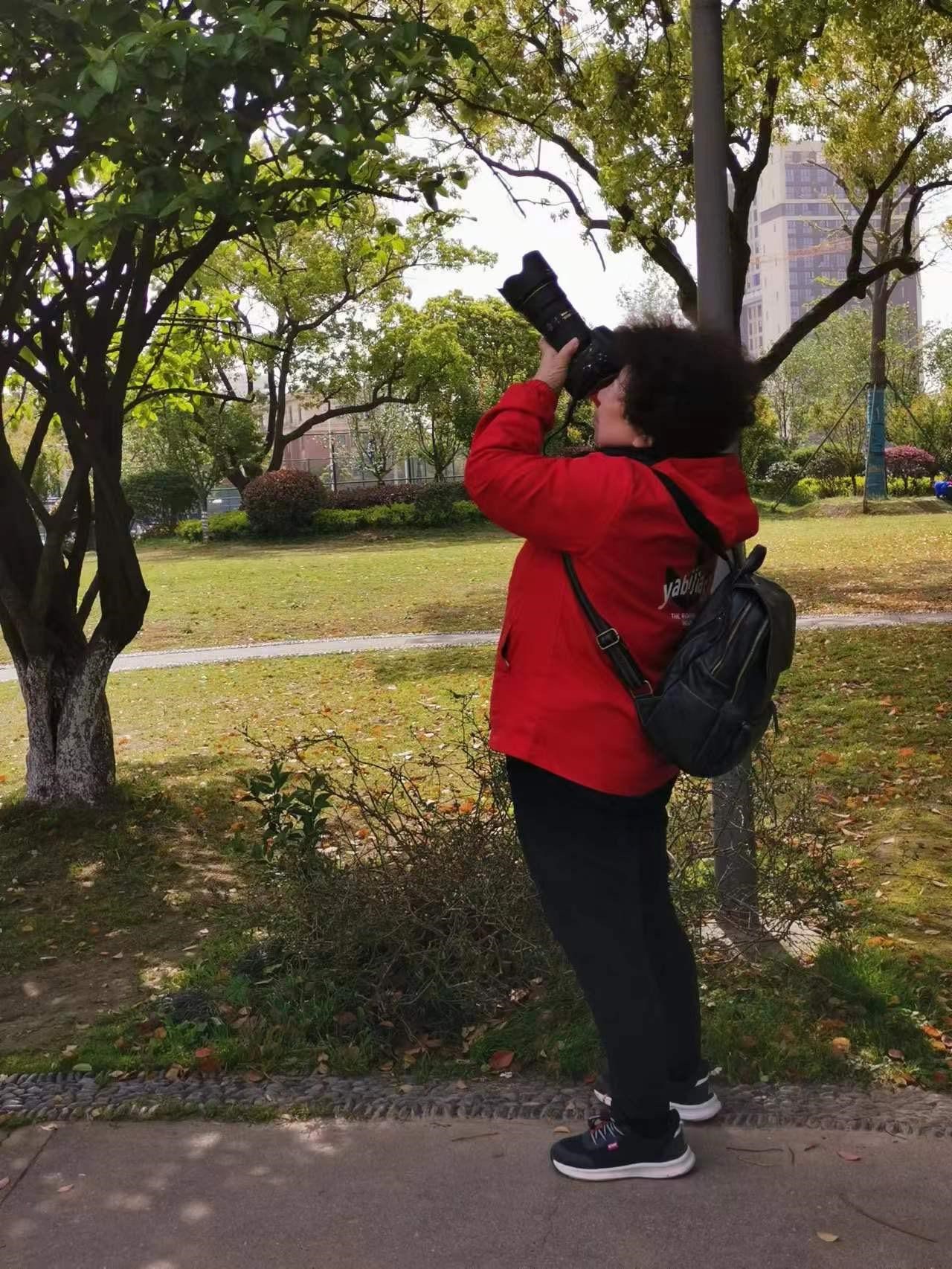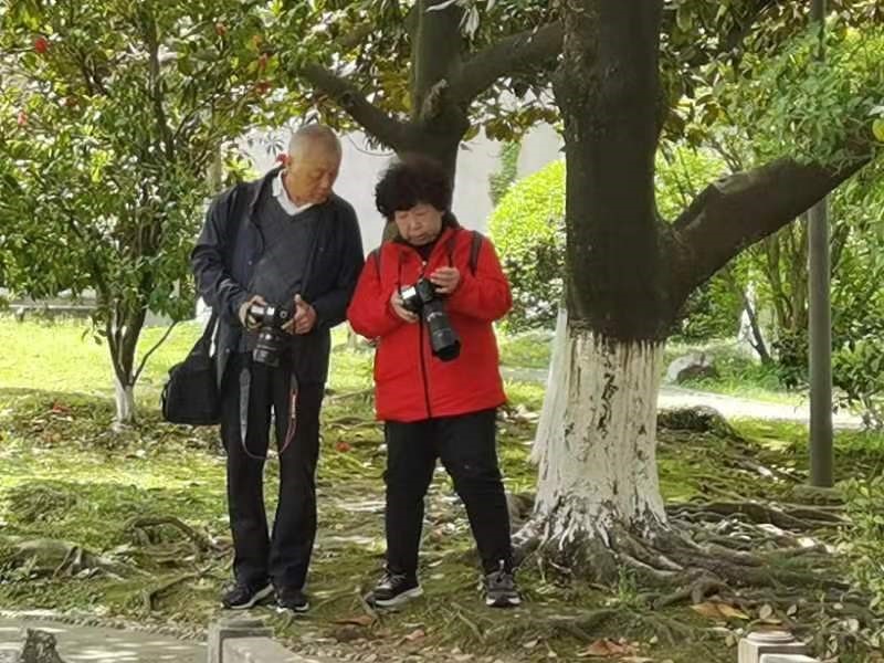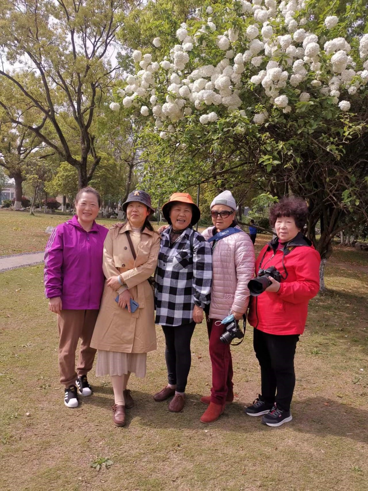 活动当天,学员们带上自己的相机,在班级刘老师的带领下来到未名园。在刘老师的讲解后,学员们开始自由拍摄,婀娜多姿的花朵、古朴雅致的连廊阁楼、繁茂翠绿的大树,学员们还学起来网络热门照片,将掉落在地的樱花捧起撒在空中,像是下了一场花瓣雨。在每一次光与影的捕捉中,在按下快门键之前主题与构图的思考中,不仅巩固了学员们在平时上课中所学的光线运用、前景、镜头光圈和角度的运用等摄影知识和技巧,也在与大自然的接触,学员们之间的交流中,放松了心情,开阔了心胸。曹阿姨说:“我们的退休生活就该这样丰富,人老心不老,和这么多朋友一起出门感觉像是在郊游。”最后,网格长余瑜为采风的学员们一起拍了大合照,给这次活动留作纪念和画上完美的句号。
