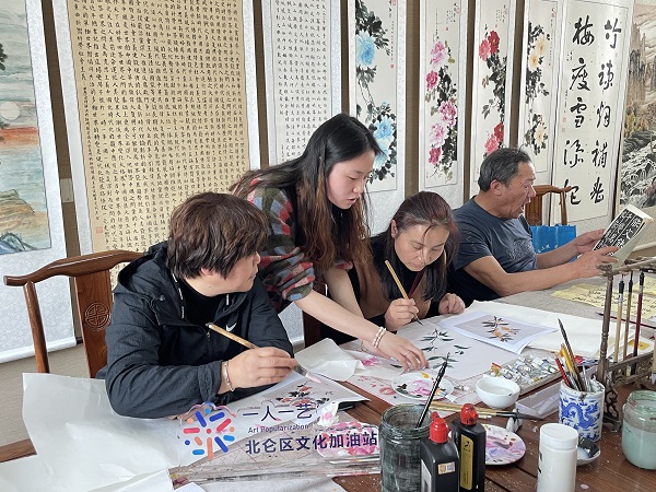 俞老师首先简单介绍书画的基本知识,然后现场为学员们边书画边讲解写意花鸟绘画技巧的基本知识和要领。随后在贾老师的指导下,学员们一笔一划认真临摹。学员们相互鼓励、互相交流、相互帮助,通过认真思考,最后都绘出了自己满意的作品。绘画结束后,俞梦露对学员们的作品进行耐心细致的点评,在错误的地方进行指正,并且鼓励学员们继续坚持绘画,在绘画中找到乐趣。