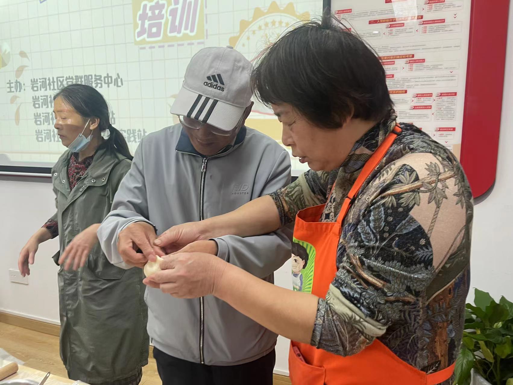 “面皮要擀得中间厚边缘薄,这样做出来的包子不容易漏汁,皮也更薄一点……”近日,岩河社区常青课堂开展中式面点制作培训,共吸引了20余名辖区内的老人参加。活动特邀桂语坊的塔峙岙大阿嫂张兆芬为老人们授课,现场欢声笑语,其乐融融。